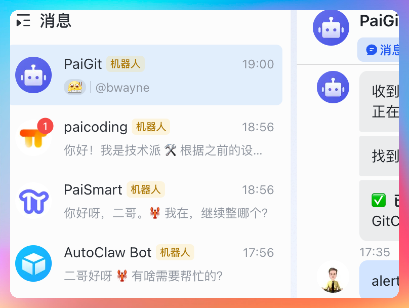 这套设计的好处很直接。很多原本容易搅在一起的东西,被它硬生生拆开了。一个 Agent 负责 coding,一个 Agent 负责飞书群消息,一个 Agent 负责日常提醒,一个 Agent 负责内容整理。每个 Agent 都有自己的工作区、自己的渠道绑定、自己的路由规则、自己的历史会话。系统会清爽很多,排查问题也容易。