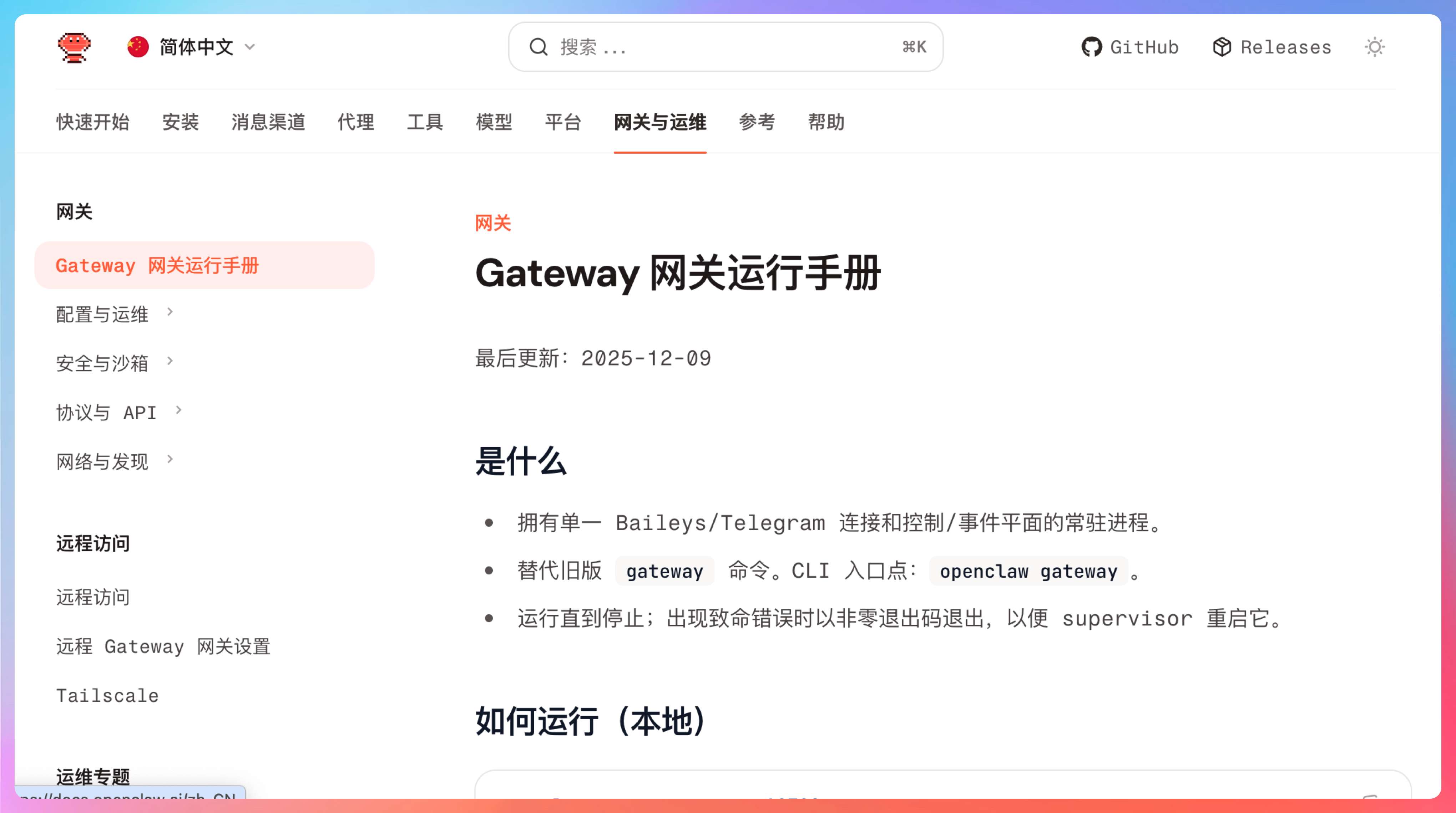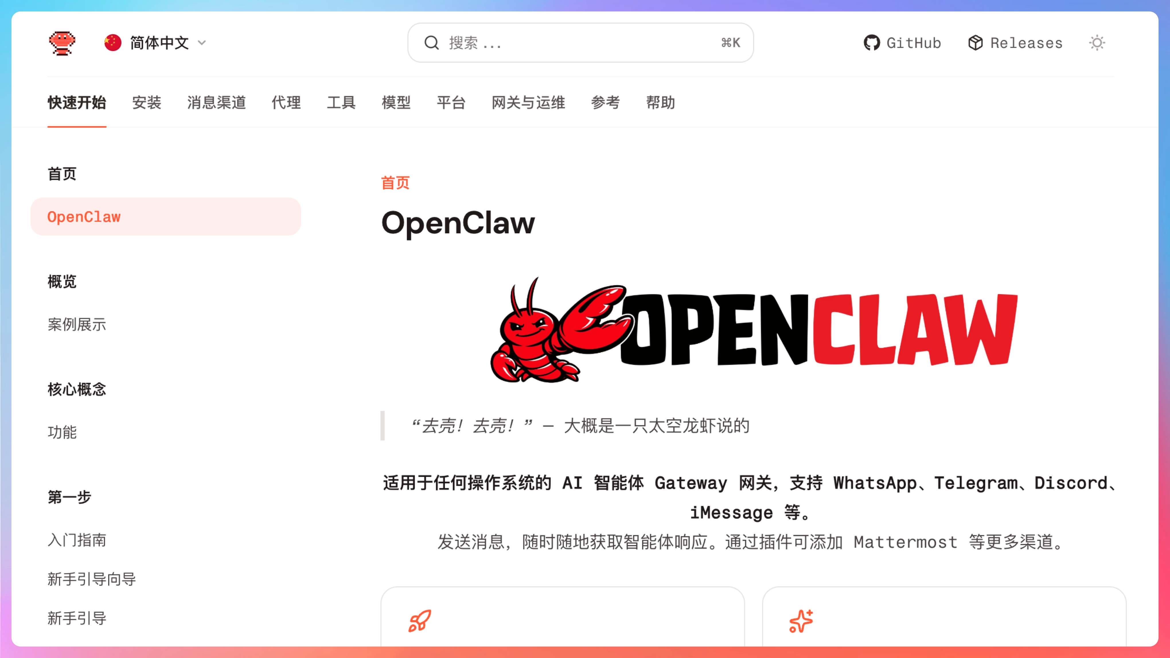 很多人第一次接触它,会把注意力放在“它能接飞书”“它能接 Telegram”“它能接 Discord”“它有一个 Web 控制台”这些表层能力上。可你只要去看一眼官方文档,就会发现项目方自己讲得非常明确:Gateway 才是整个系统的单一事实来源。会话、路由、渠道连接、节点、控制界面,很多核心状态都围着它转。
