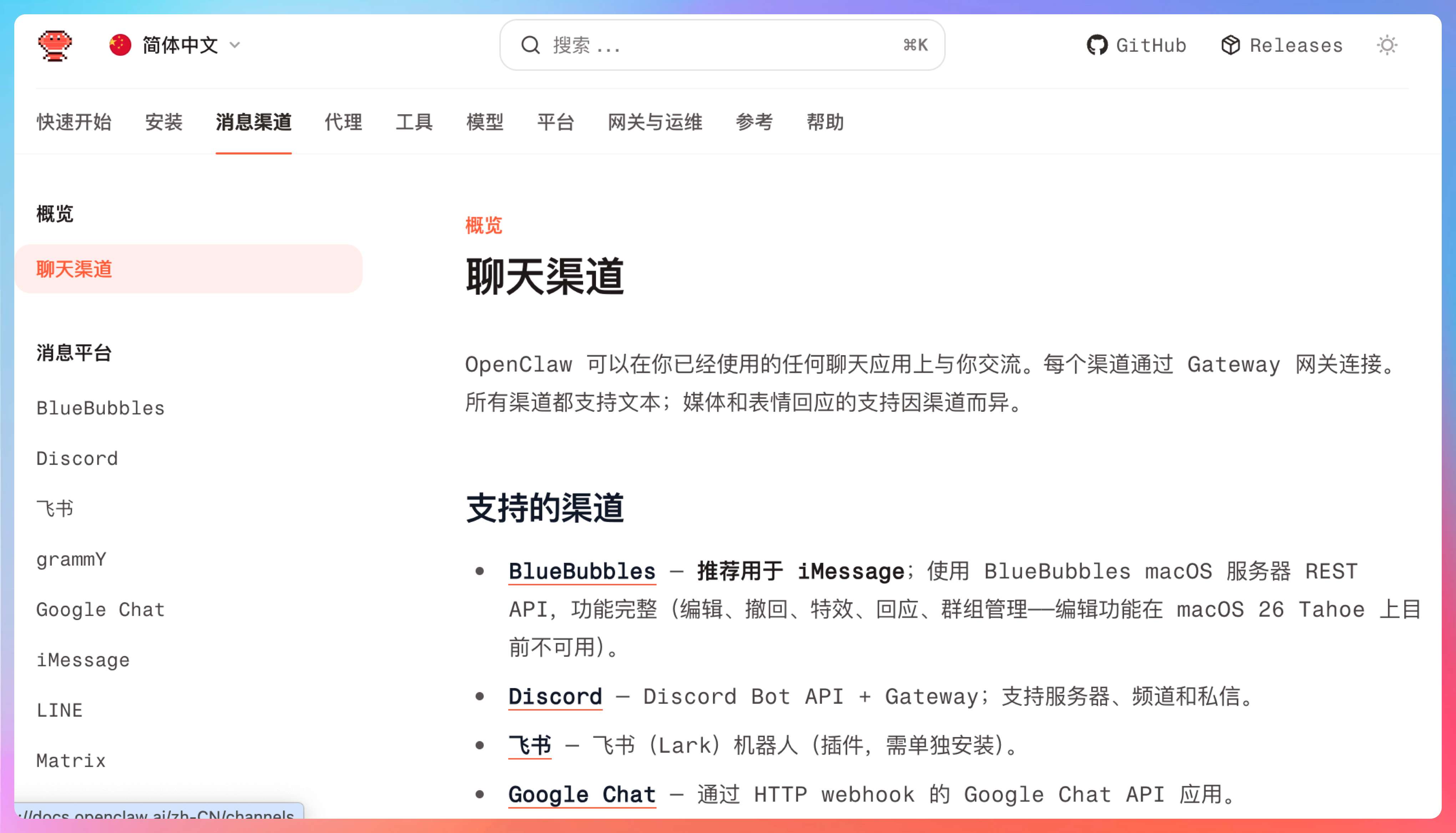 第二个地方是 Channels。你不一定每个都用,但至少要挑一个你熟悉的渠道去读。因为渠道层最能帮助你理解 OpenClaw 是怎么把“聊天消息”映射成“可持续运行的系统输入”的。飞书、Telegram、Discord 这些看上去只是入口不同,背后其实都要过 Gateway、Session、Routing 这套骨架。