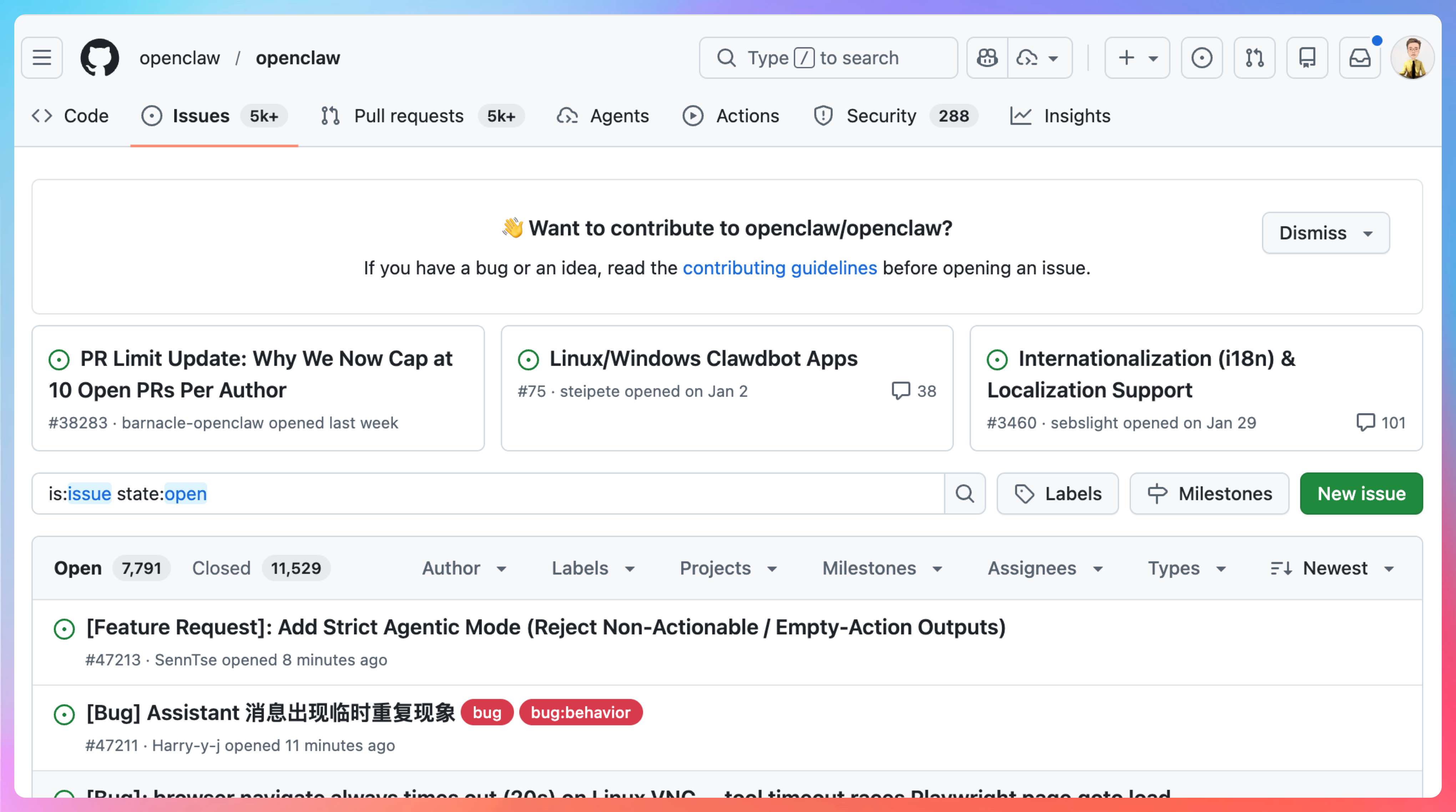 第三个地方是 CONTRIBUTING 和 Issues。很多人学开源项目,只会看 README,不看社区协作。其实对于 OpenClaw 这种更新快、生态大的仓库,PR、Issue、文档变更、版本发布记录,往往比死盯某个文件更能帮助你理解项目的演化方向。你会知道哪些能力刚加上,哪些概念最近被重写,哪些设计已经稳定了。