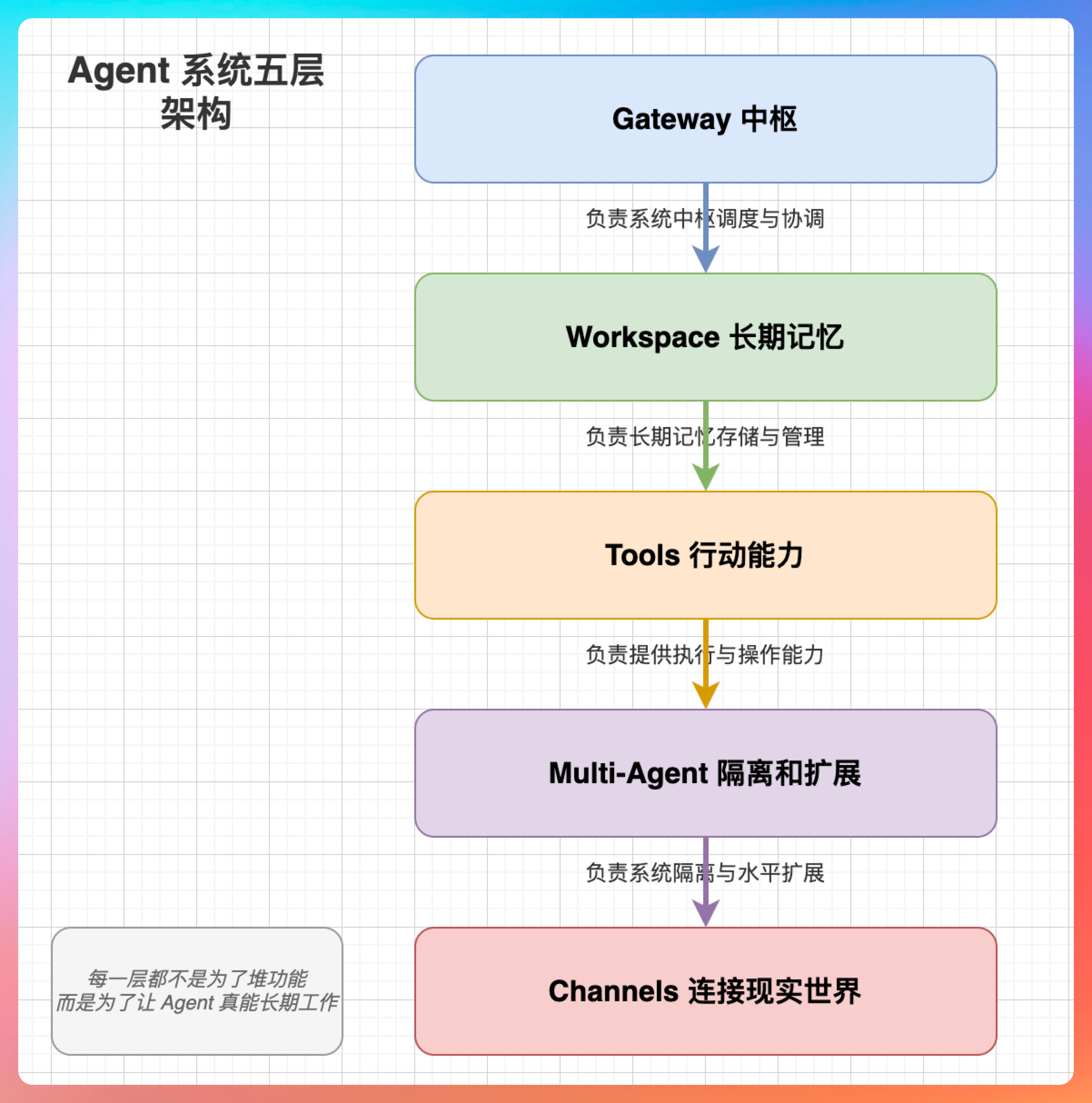 Gateway 负责中枢,Workspace 负责长期记忆,Tools 负责行动能力,Multi-Agent 负责隔离和扩展,Channels 负责连接现实世界。每一层都不是为了堆功能,而是为了让 Agent 真能长期工作。