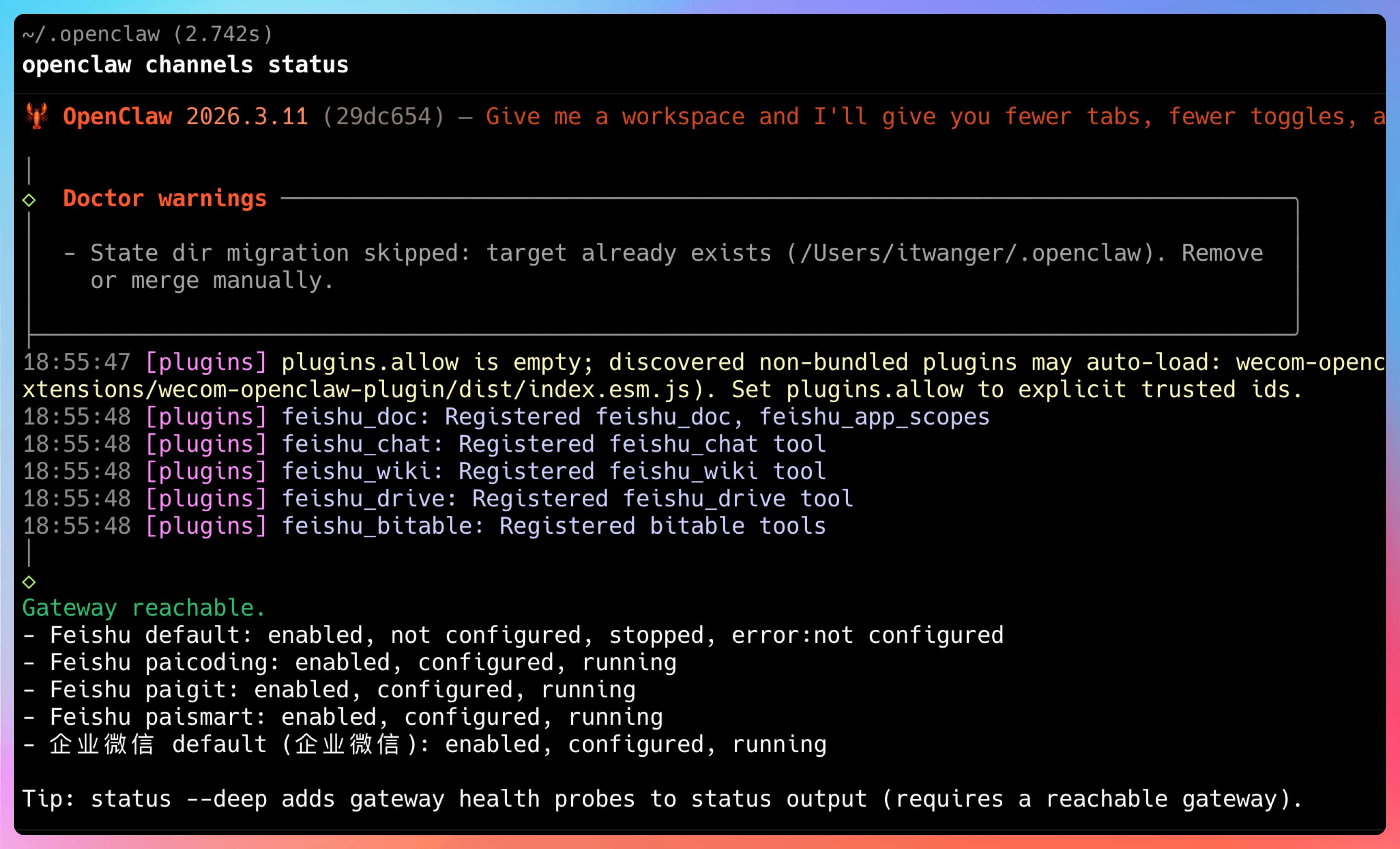 先把结论摆这儿:OpenClaw 真正有意思的,不是某一个命令,也不是某一个插件,而是它把“聊天入口、代理运行时、工作区记忆、工具调用、多 Agent 路由”串成了一条完整链路。