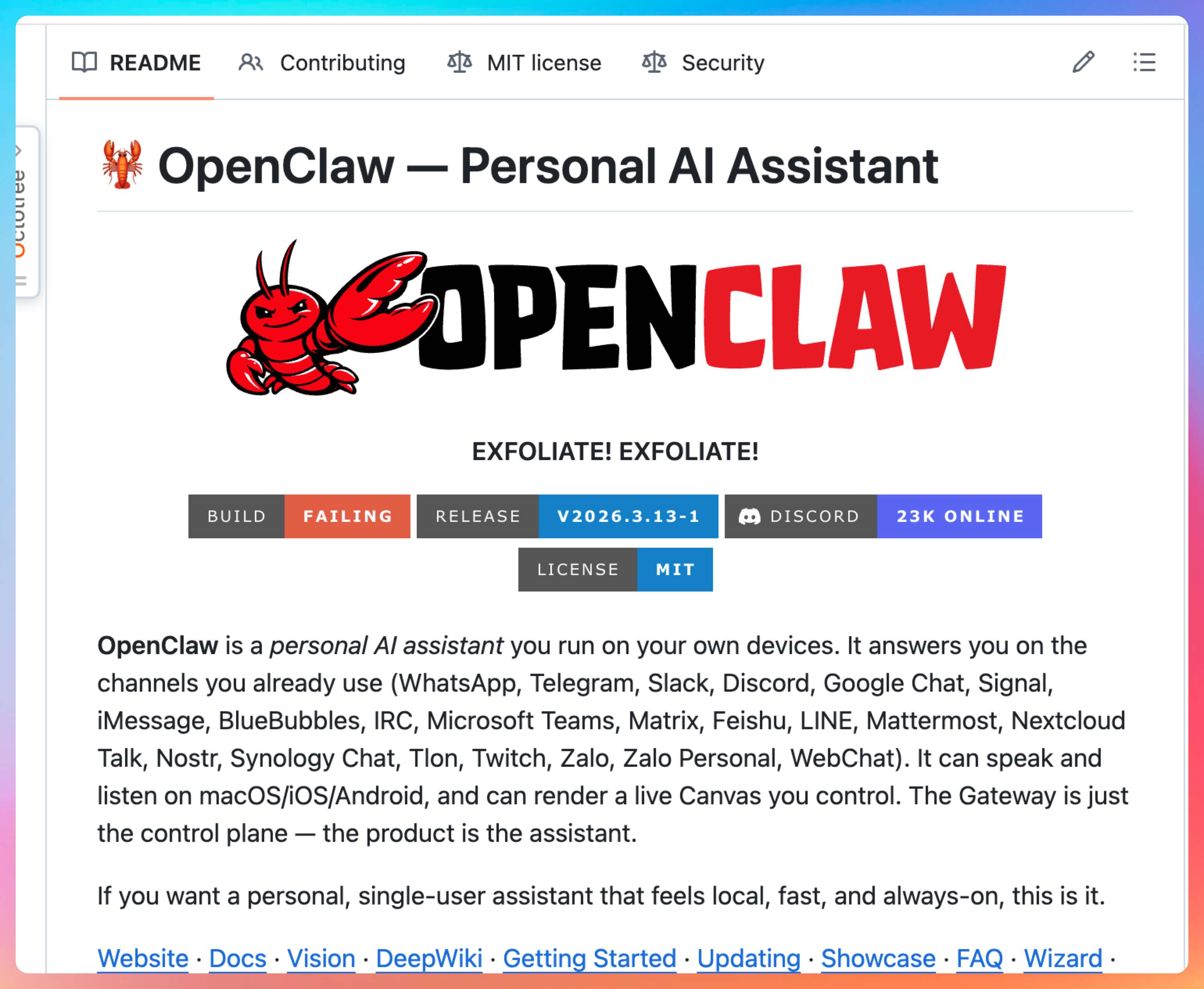 这次咱们换个思路,不去一头扎进源码里硬啃,而是按“仓库首页,看官方文档,看 Gateway,看 Workspace,看 Multi-Agent,再看 Tools 和扩展”的顺序,把 OpenClaw 的 GitHub 仓库过一遍。
