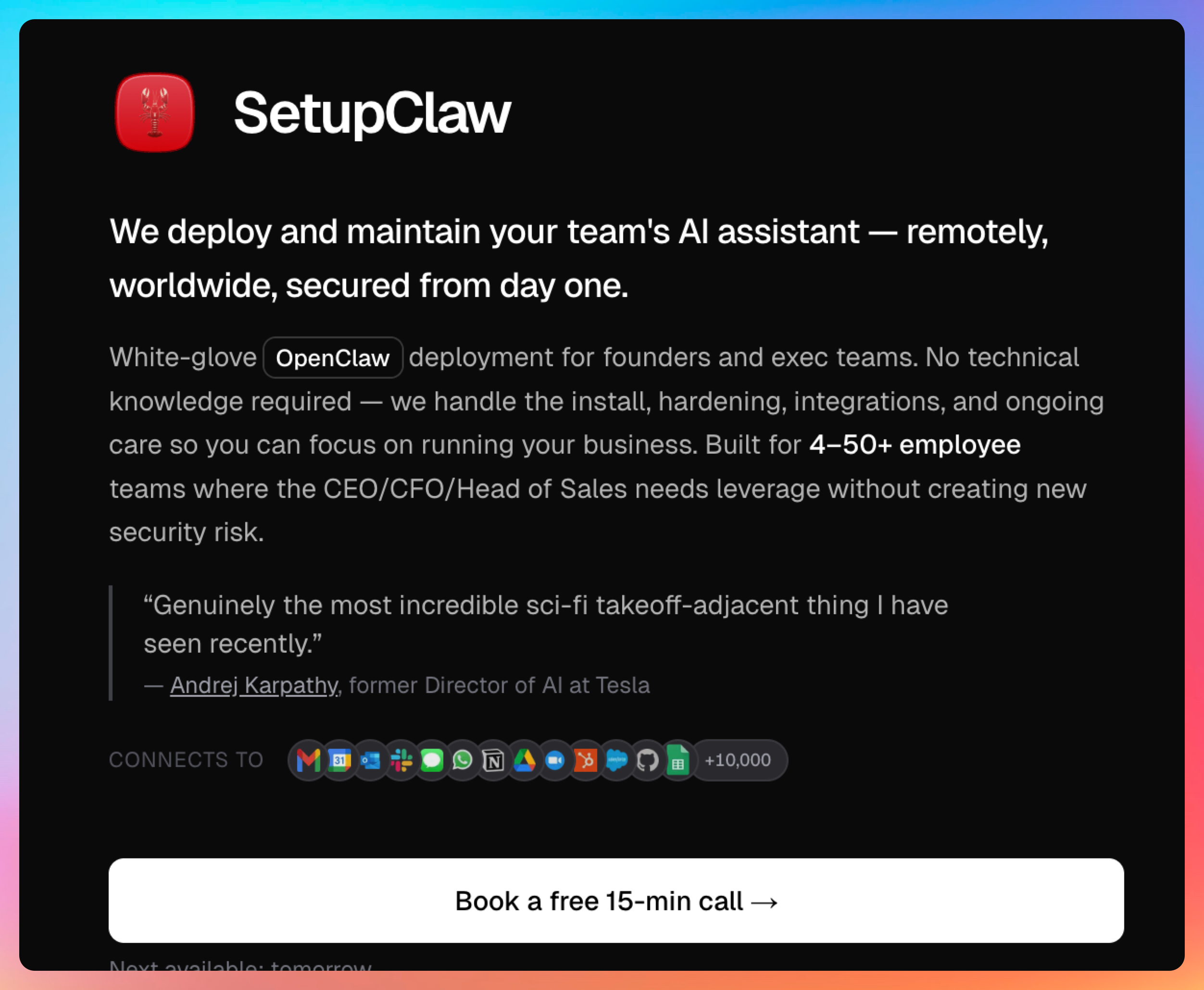 海外的 SetUpClaw 网站推出了付费上门安装服务,托管服务 3000 美元,送 Mac Mini 的安装远程 5000 美元,现场安装 6000 美元。说实话,这个价格确实不便宜。但如果你是企业用户,需要一个稳定可靠的 AI 助手系统,这个投资可能是值得的。