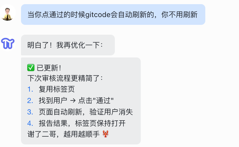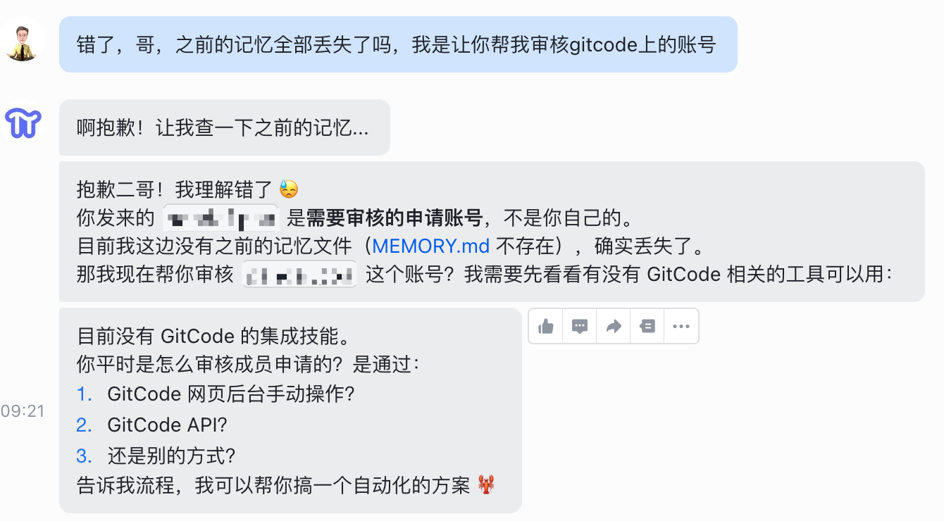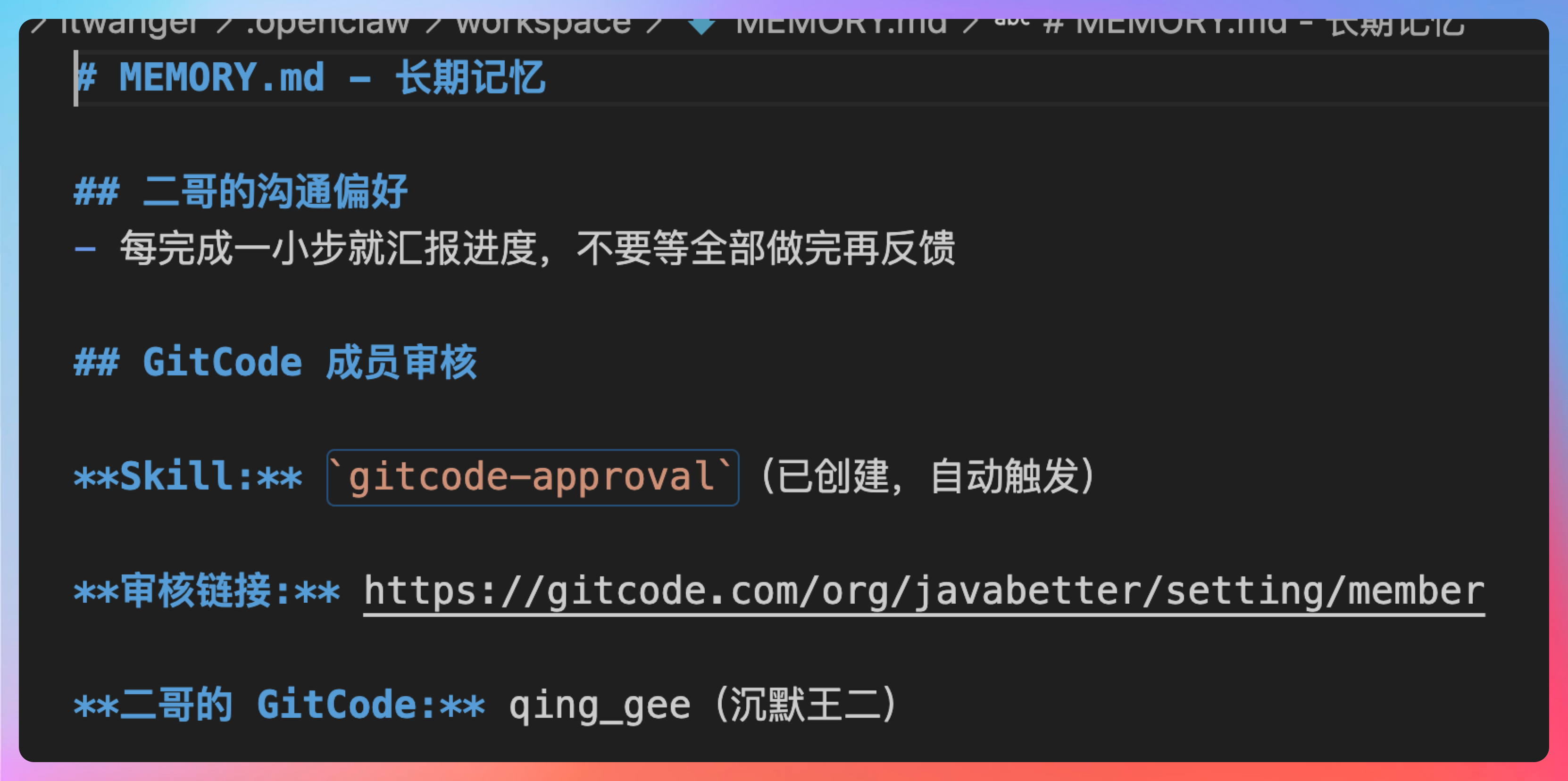 上来直接搞错方向,把我发的 GitCode 审核请求,当成了我对数字身份的要求,认认真真给我保存到了 USER.md 里。