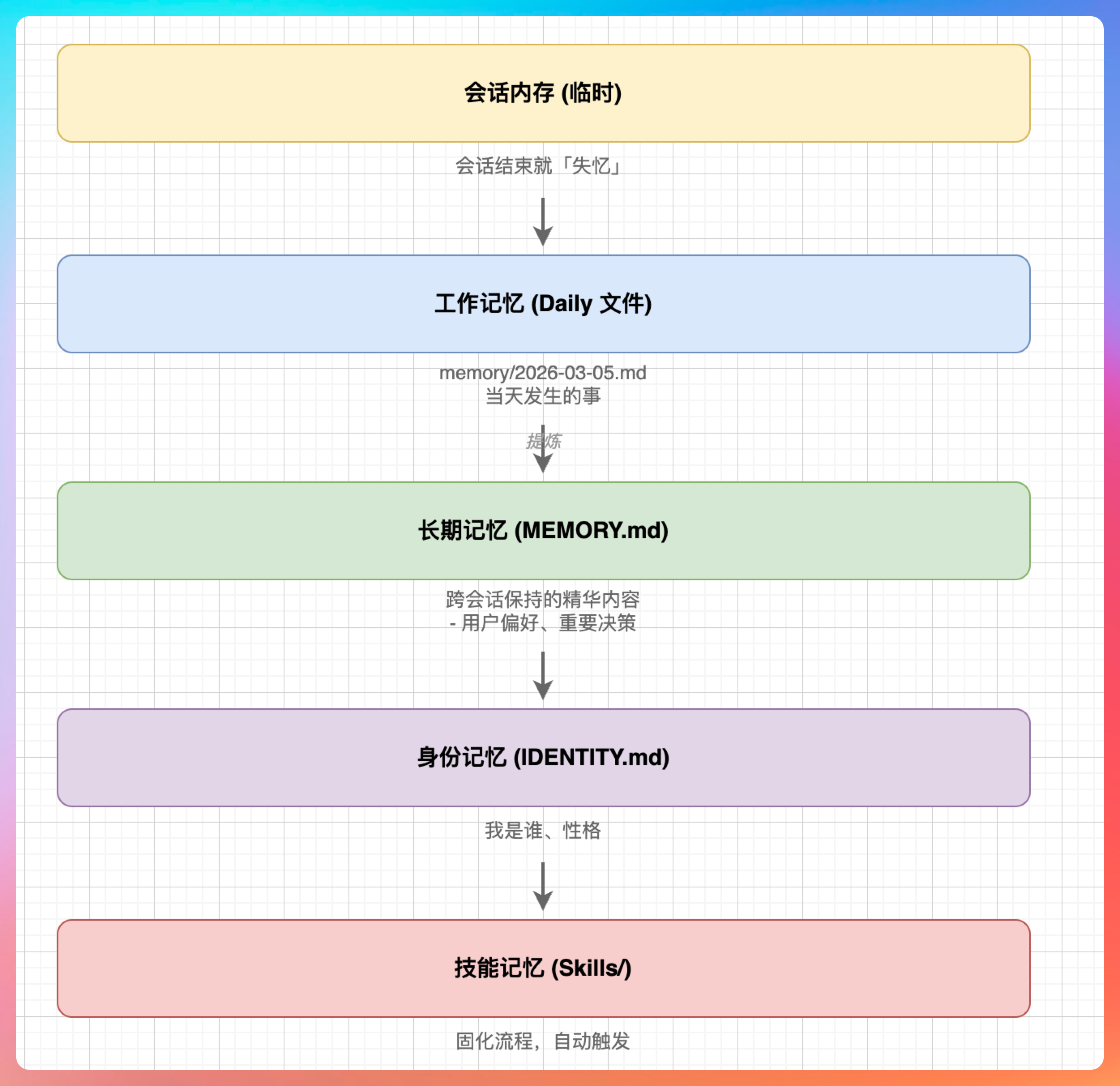 - 日志记录写入每日 Daily 文件,用于回溯,但不直接参与下次会话的上下文构建。