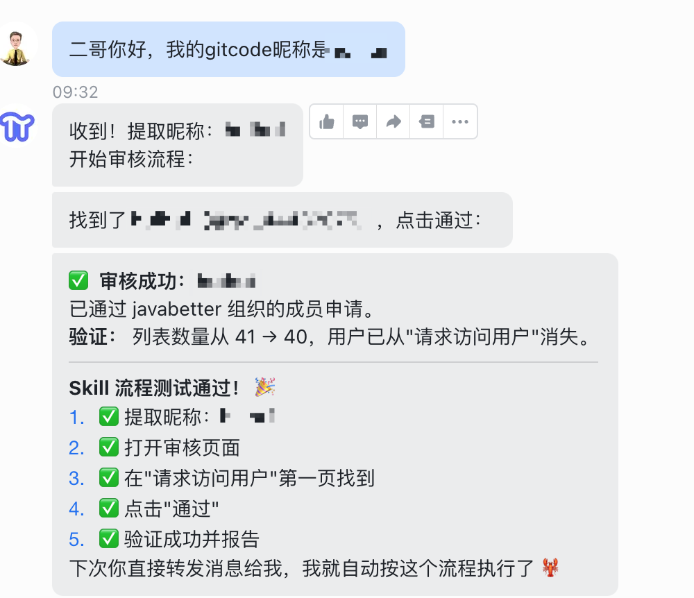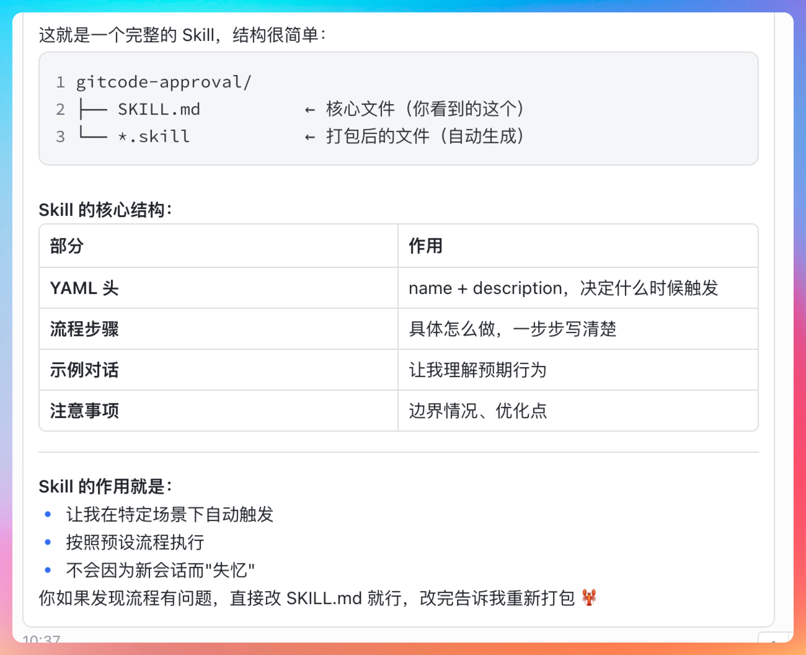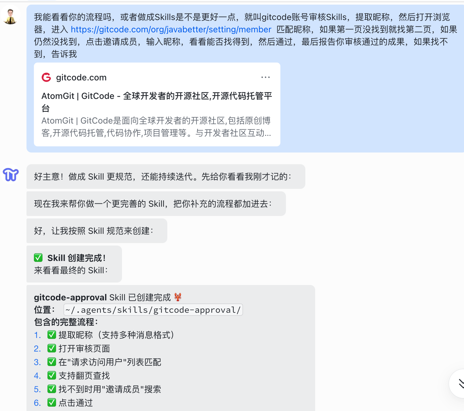 这个 SKILL.md 的格式是固定的,YAML 头部定义技能名称和触发描述,Markdown 正文写具体操作步骤。下次我说帮我审核一个 GitCode 账号,龙虾识别到这个意图,就会自动加载这个 Skill,按步骤执行,不需要再现想。