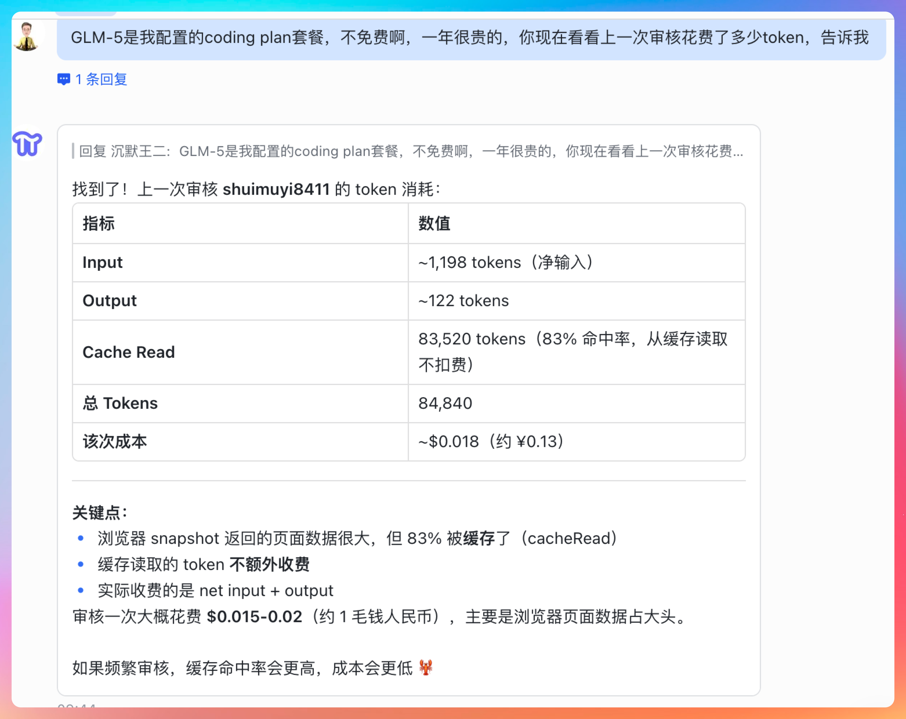token 的消耗主要发生在浏览器 snapshot 返回的页面数据,但 83% 被缓存了(cacheRead),如果频繁审核,缓存命中率会更高,成本会更低。