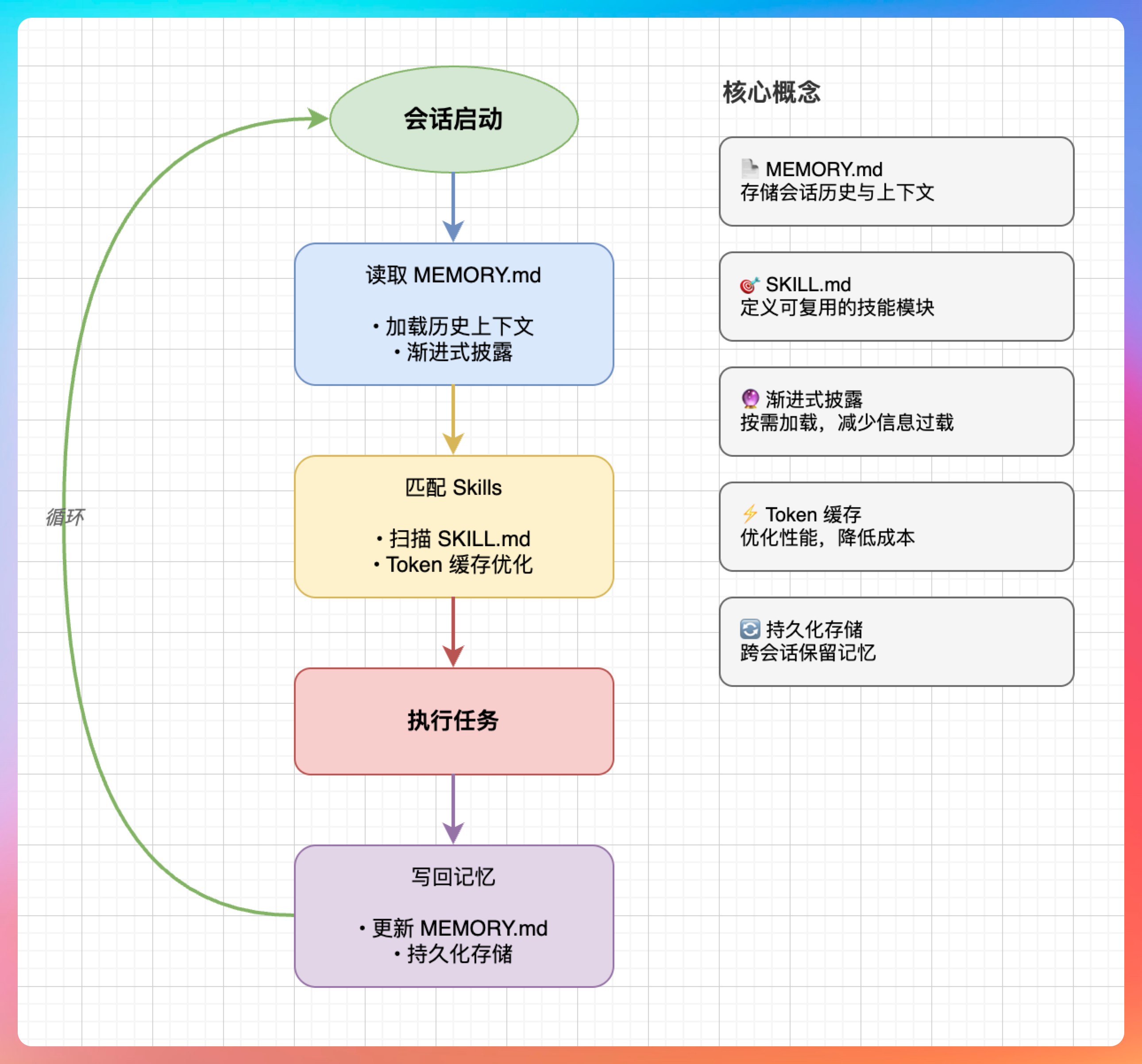 机制是这样的:每次打开新会话,龙虾会先读取工作目录下的 MEMORY.md 文件,从里面恢复上下文。然后读取今天的 Daily 文件,匹配 Skills 触发流程,执行完之后再把新的记忆写回去,下次会话继续读取。