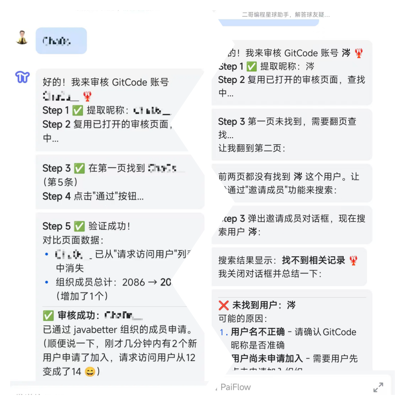 重新告诉 PaiFlow 我们要它干的事情——帮我审核 GitCode 账号。