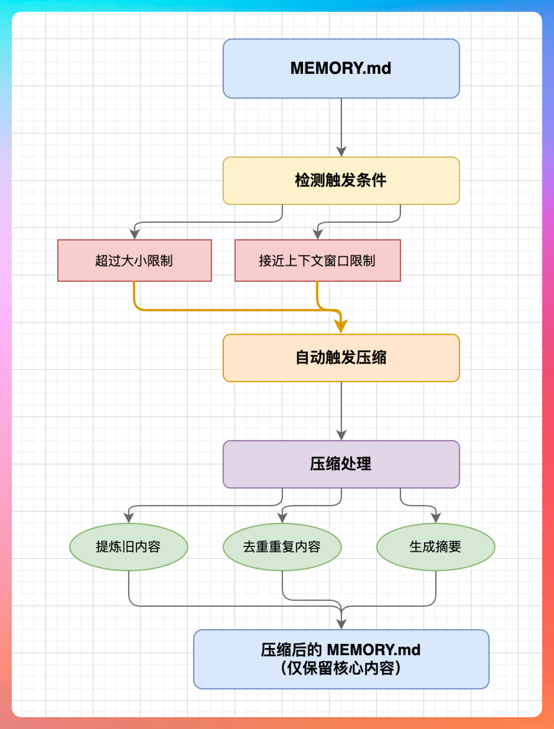 好在 OpenClaw 有一套切片压缩与摘要机制来应对。当 MEMORY.md 超过一定大小,或者接近模型上下文窗口限制时,OpenClaw 会自动触发压缩:把旧的、重复的内容提炼成摘要,只保留最核心的部分。