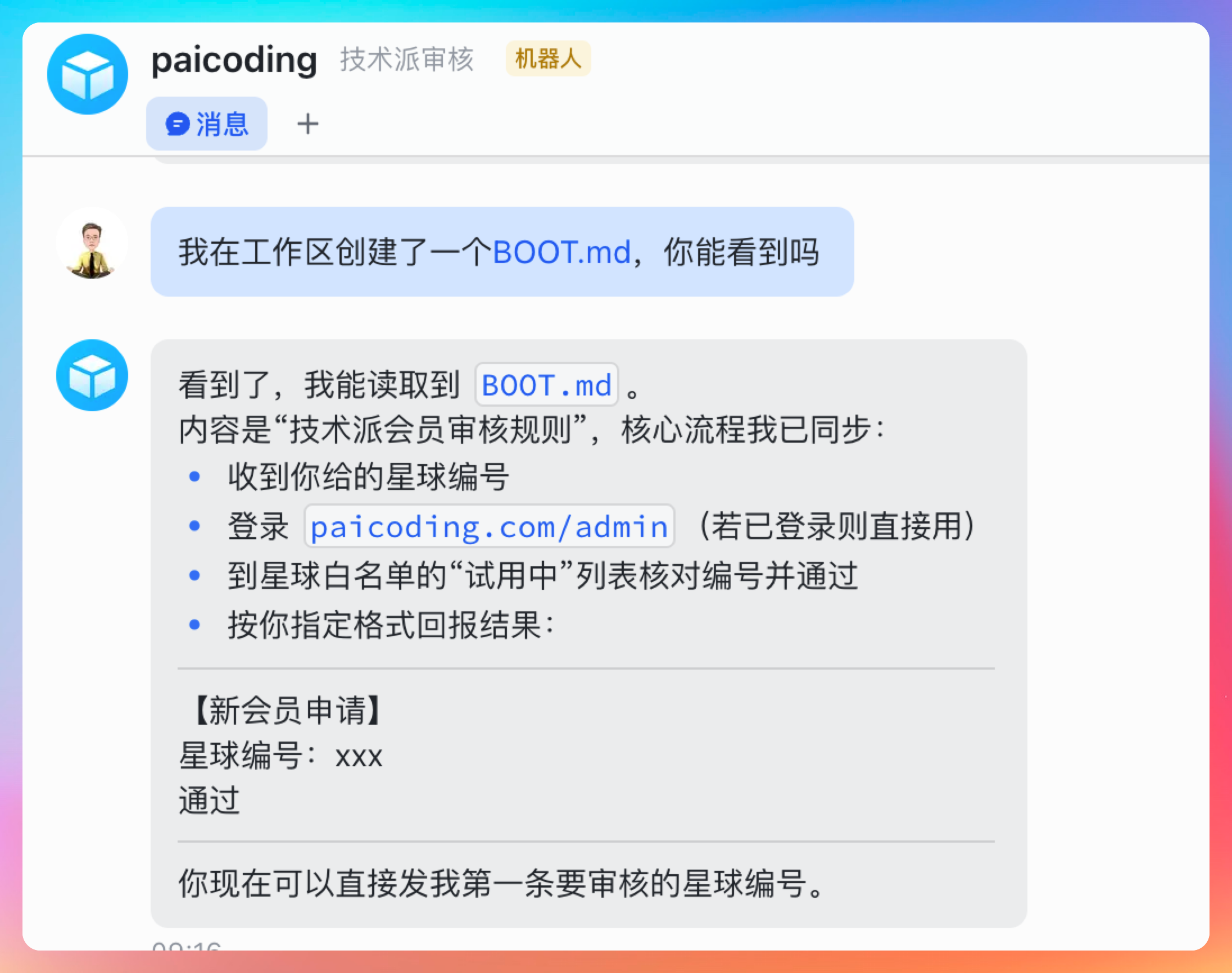 用户申请加入 → 飞书应用 B 发送消息 → Agent B(paicoding)处理 → 审核通知飞书好,搞清楚底层的逻辑后。现在动手,创建专门做技术派会员审核的第二个 Agent 吧。