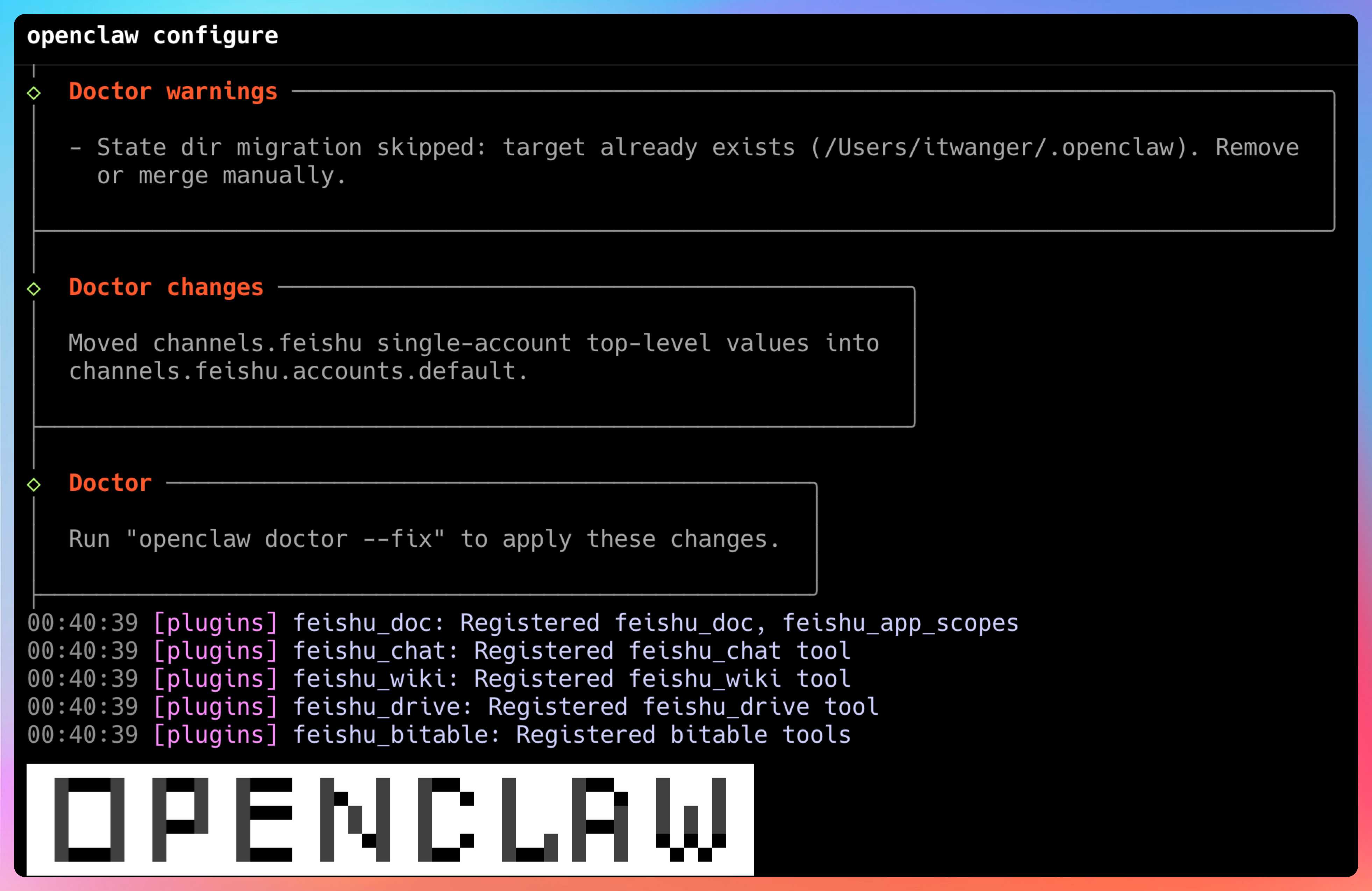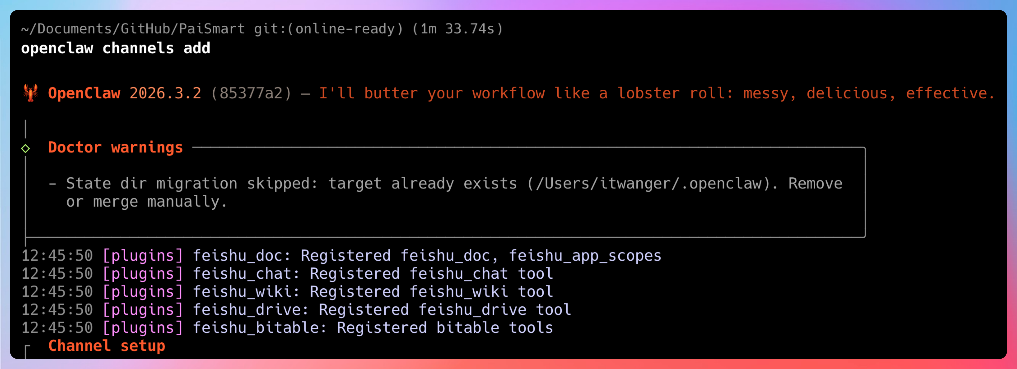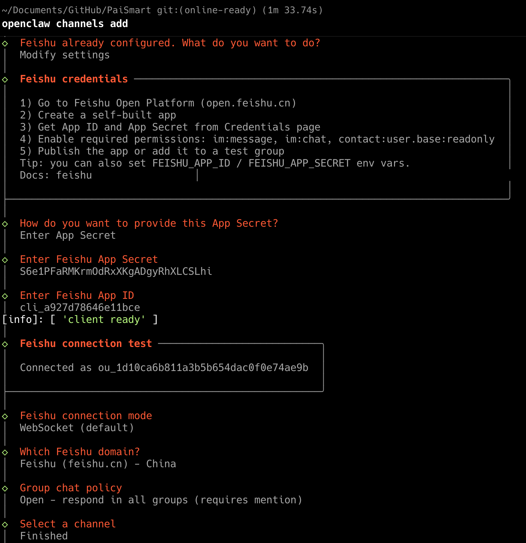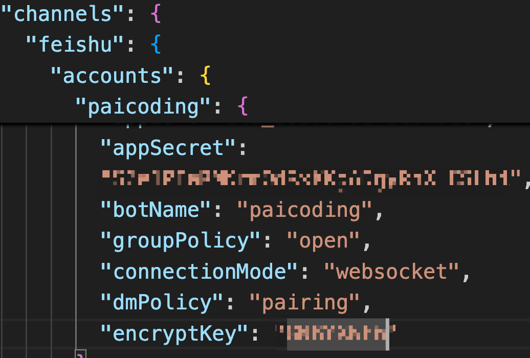 当然了,如果你这一步无法生效,没办法保存。可以重新执行一次 openclaw channels add。通过OpenClaw提供的引导模式,配置一遍飞书频道。