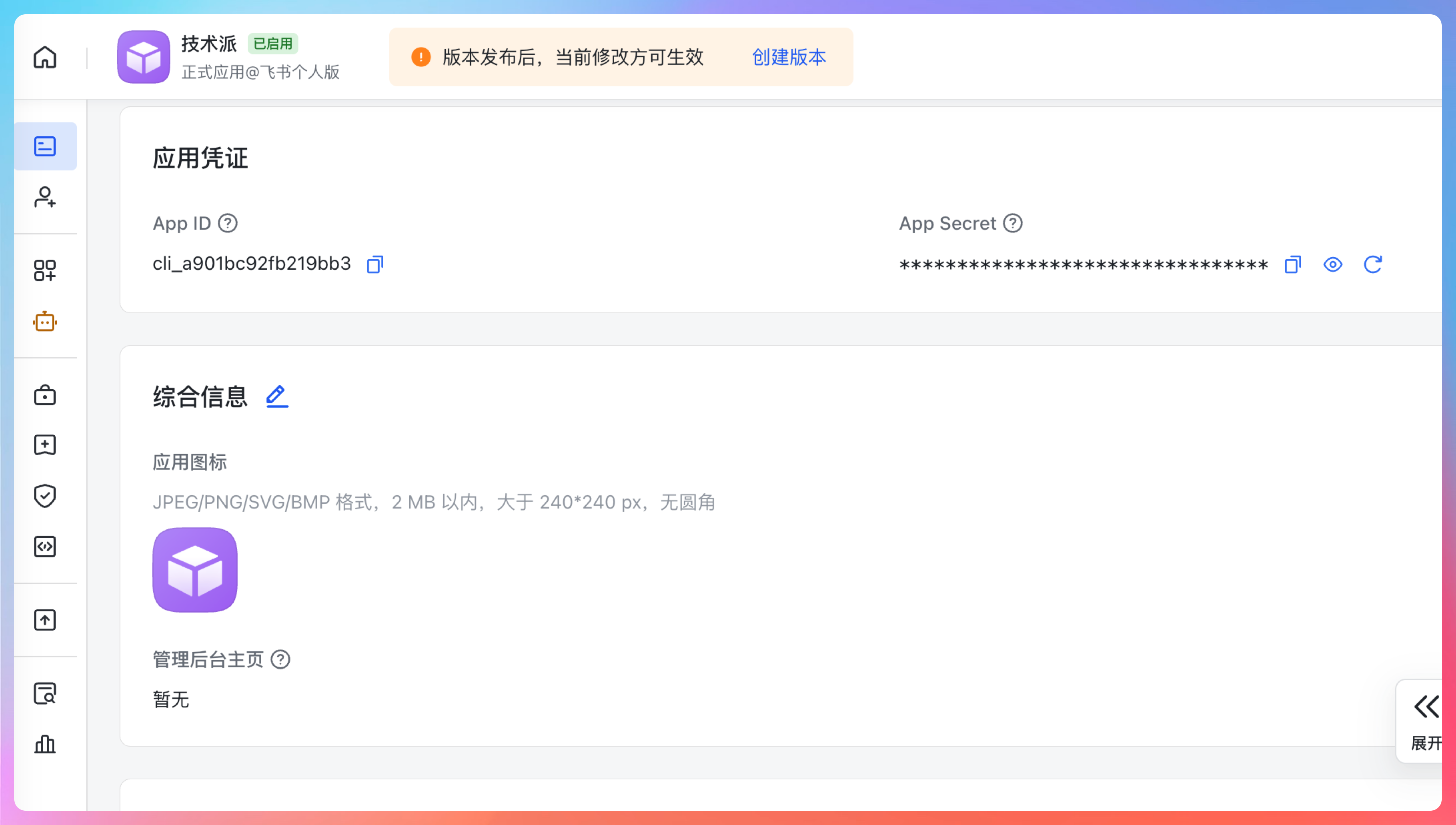 创建一个新的企业自建应用,名字就叫 技术派 吧,和 Agent 保持一致,方便管理。