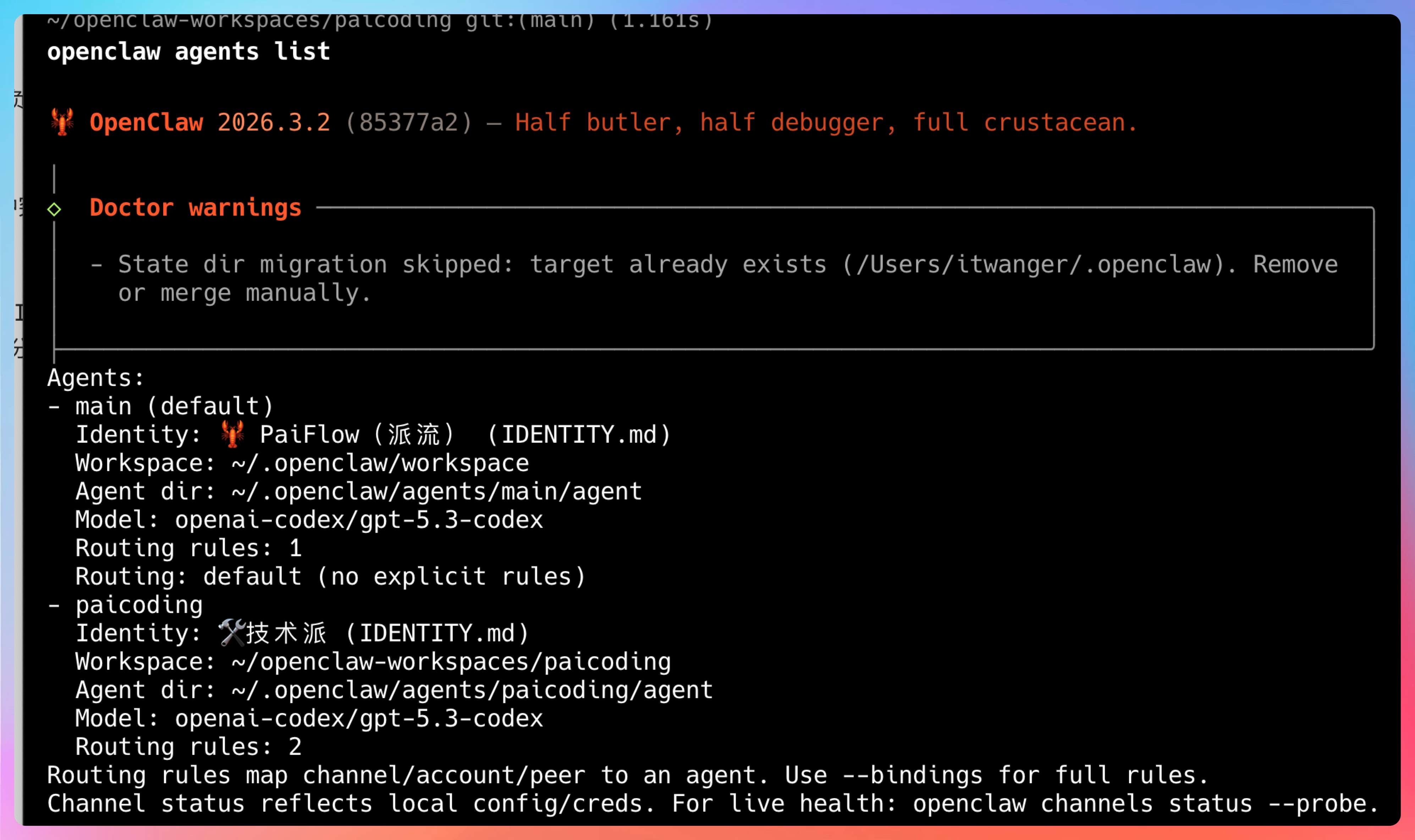 配置完成后,可以通过 openclaw agents list 查看多个Agent。