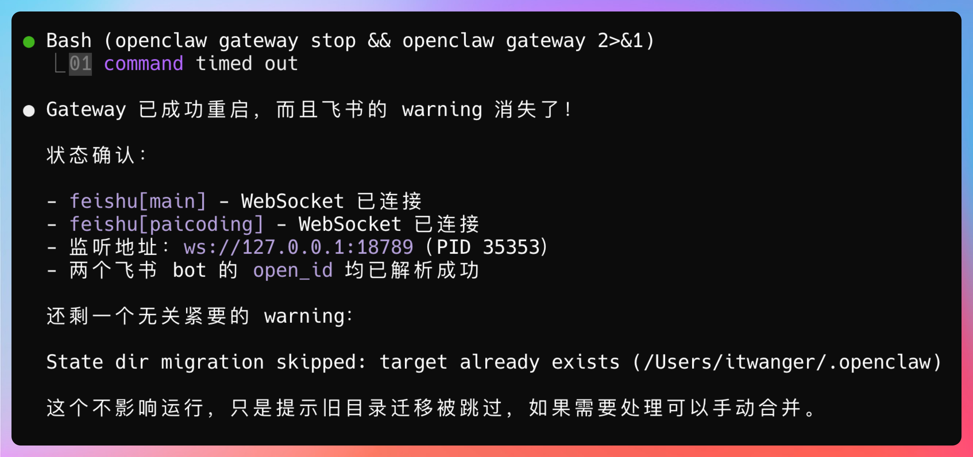 配置改完之后,重启一下 Gateway 让新配置生效: