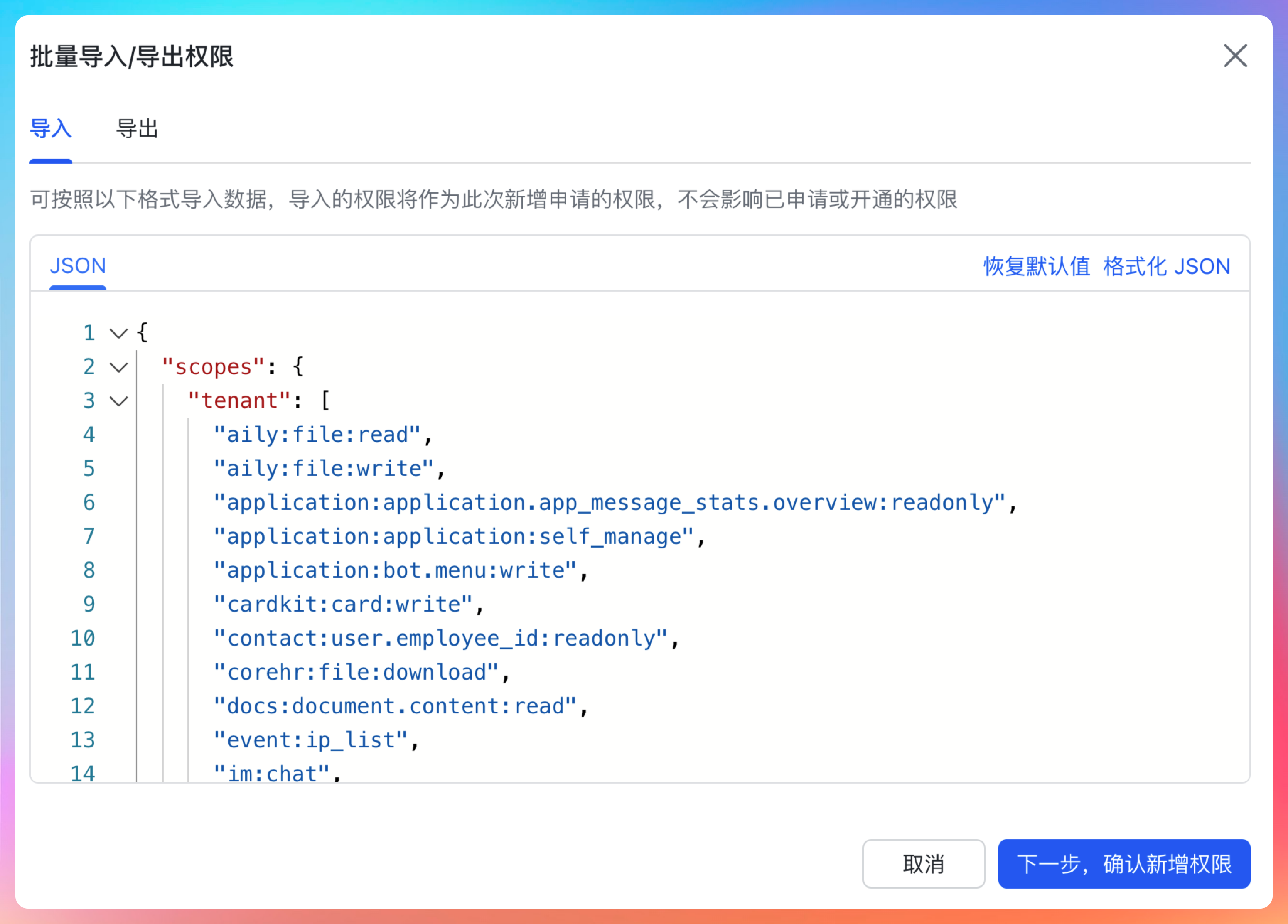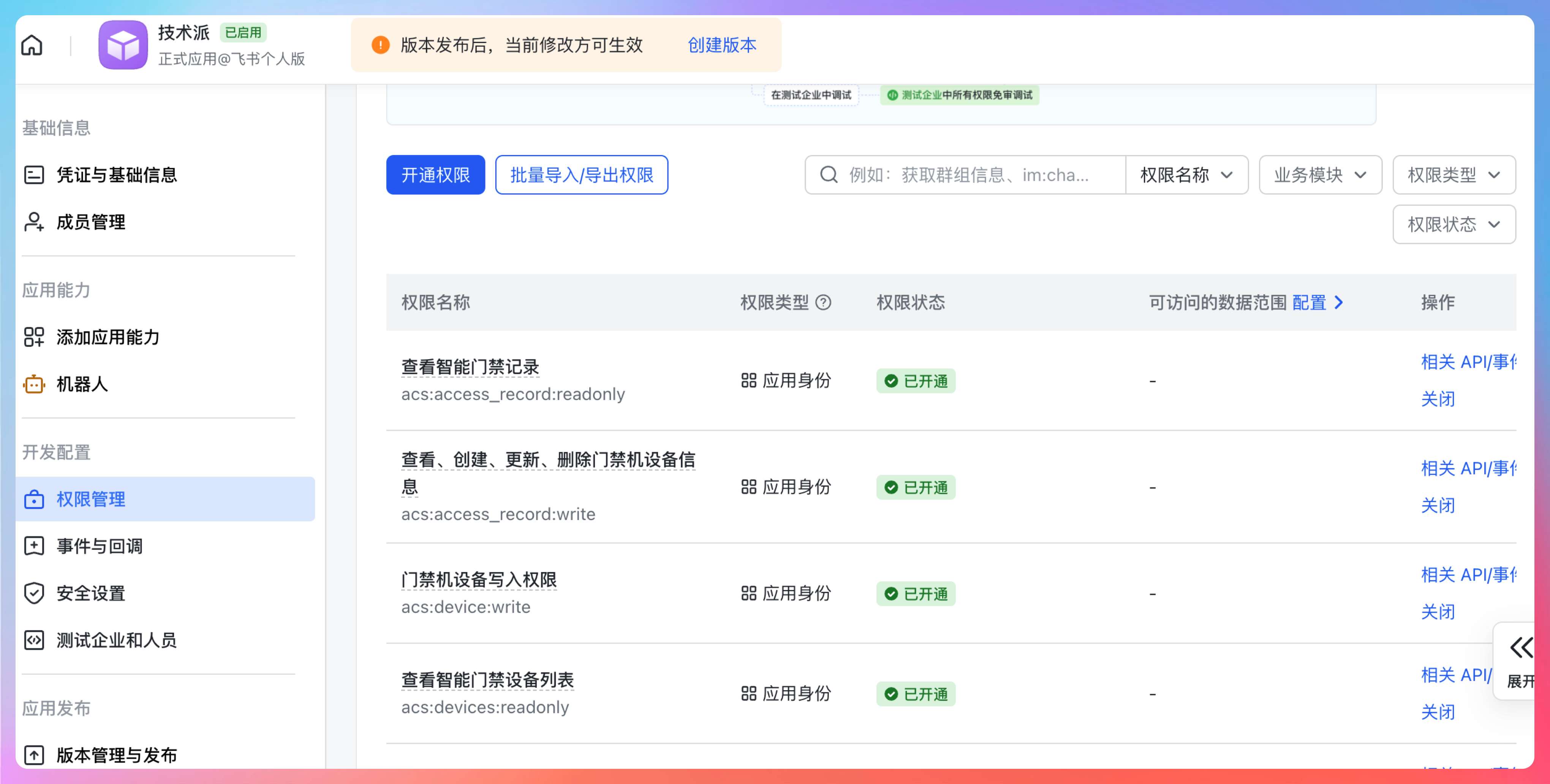 然后是添加机器人能力,在权限管理页面,点击批量导入按钮。