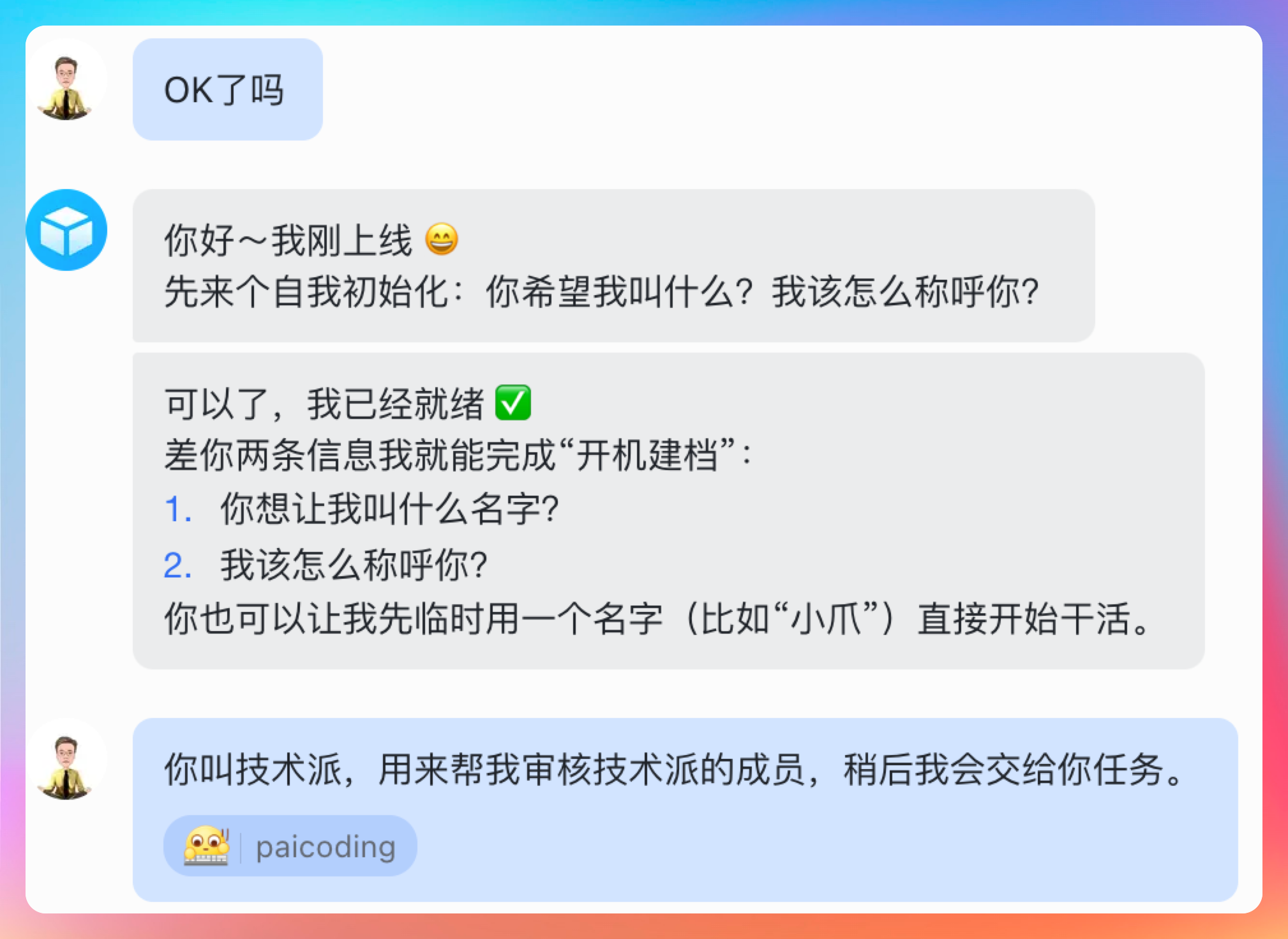 既然一只龙虾能跑这么顺利,能不能再整一个专门用来审核技术派的龙虾,也就是我的龙虾二号,名字暂定为 paicoding 吧。