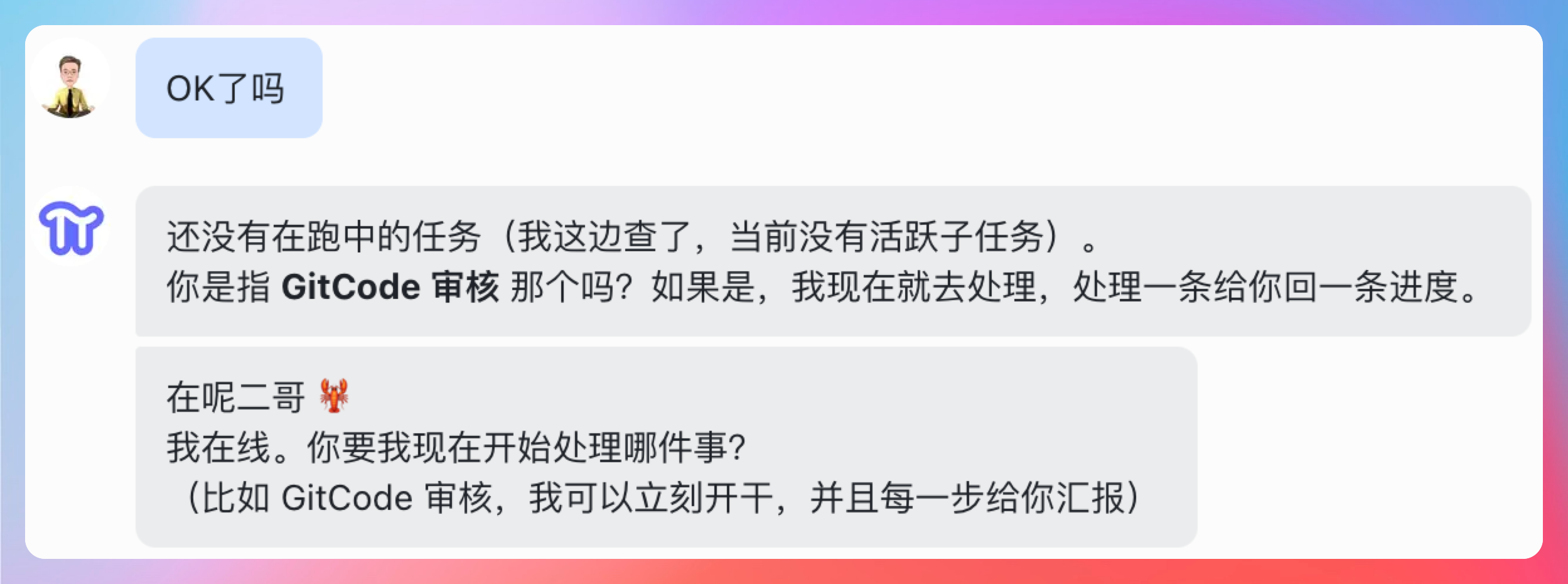 到此为止,我们的龙虾二号员工就算是正式上岗干活了。