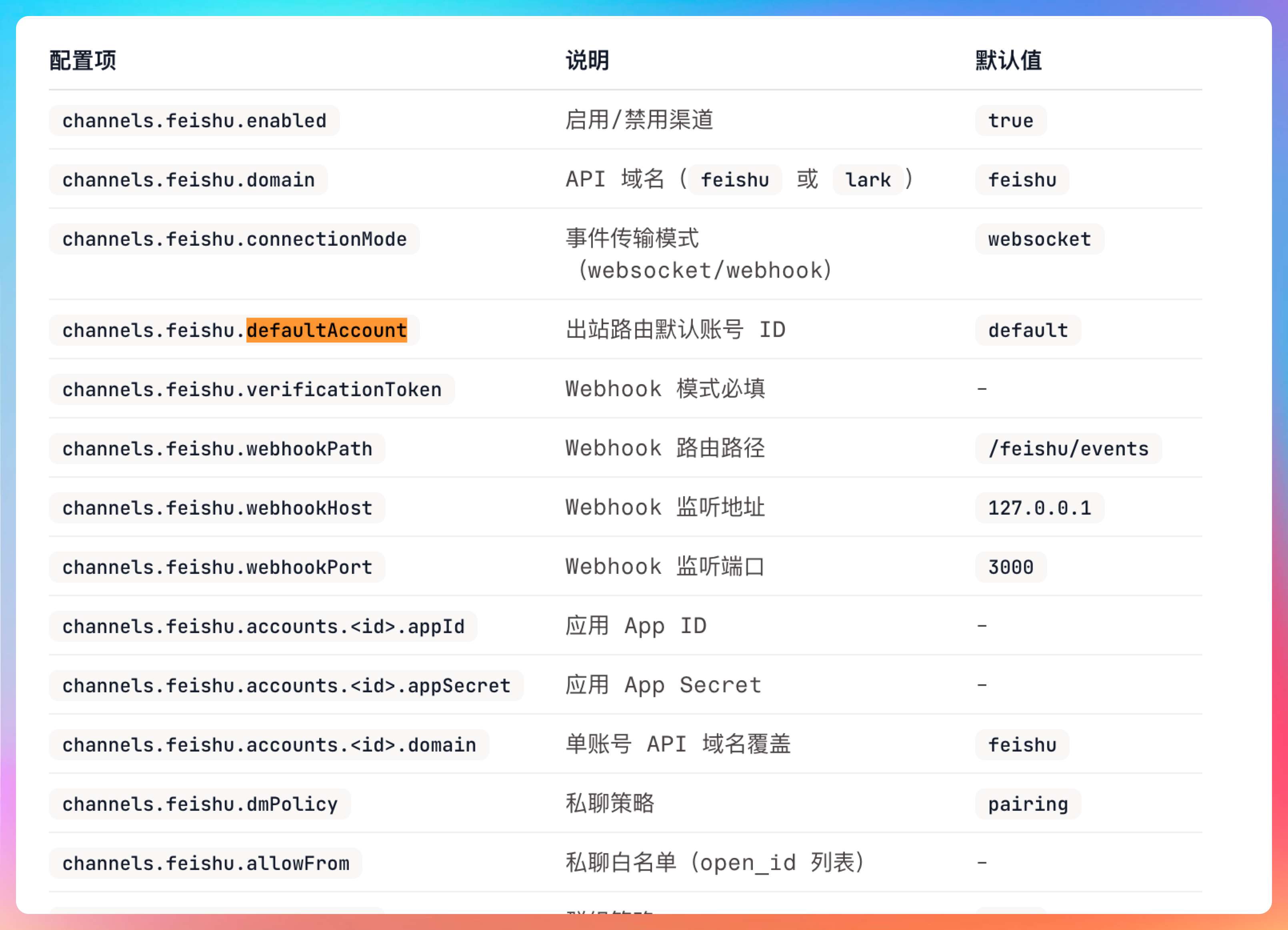 - defaultAccount 表示出站路由的默认账号 ID,其实在我们目前的场景下,并不需要,因为我们已经指定了不同的飞书应用关联不同的Agent。