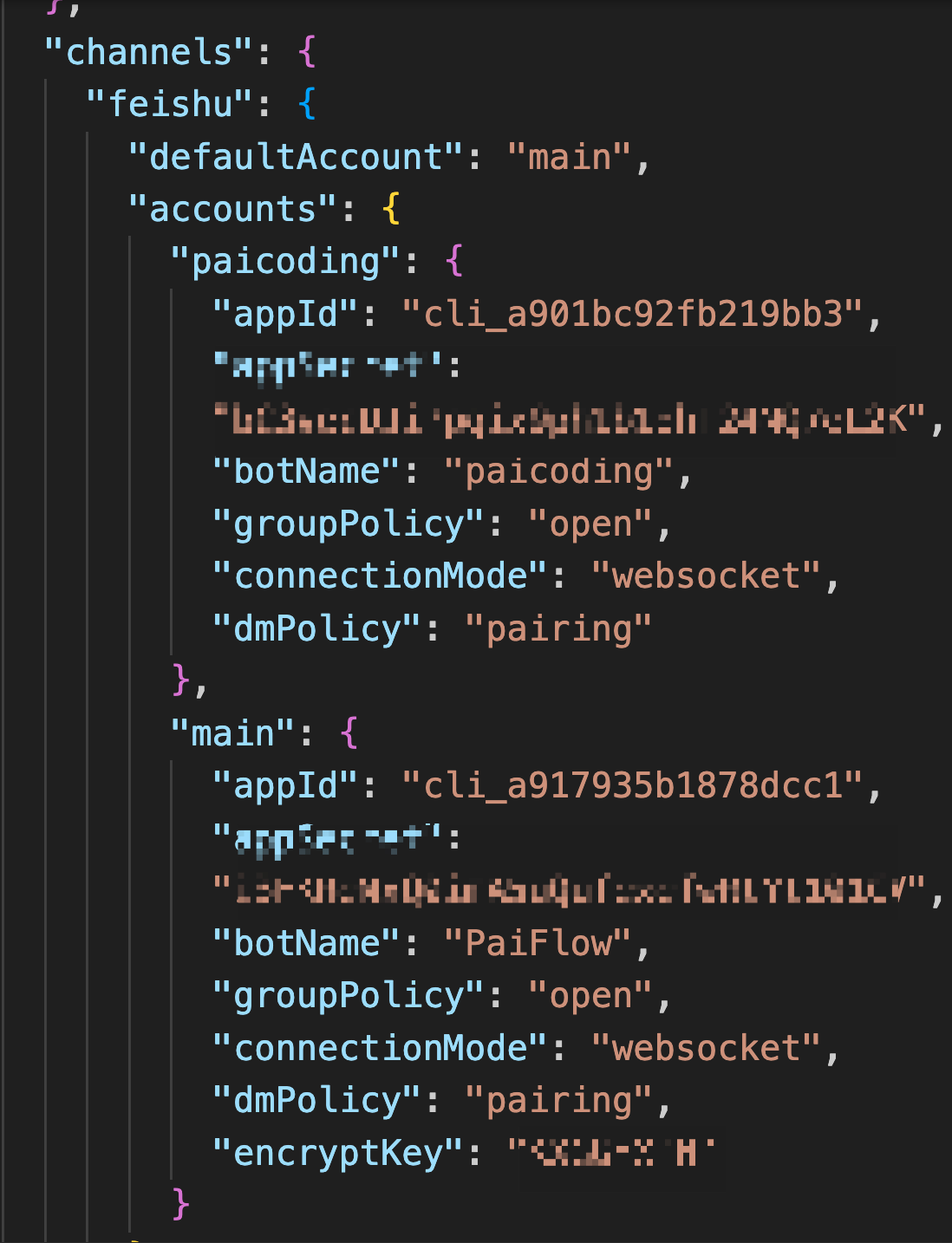 换句话说,main 是我们之前配置 PaiFlow 飞书应用的 App ID,paicoding 是我们刚刚配置 paicoding 飞书应用的 App ID。