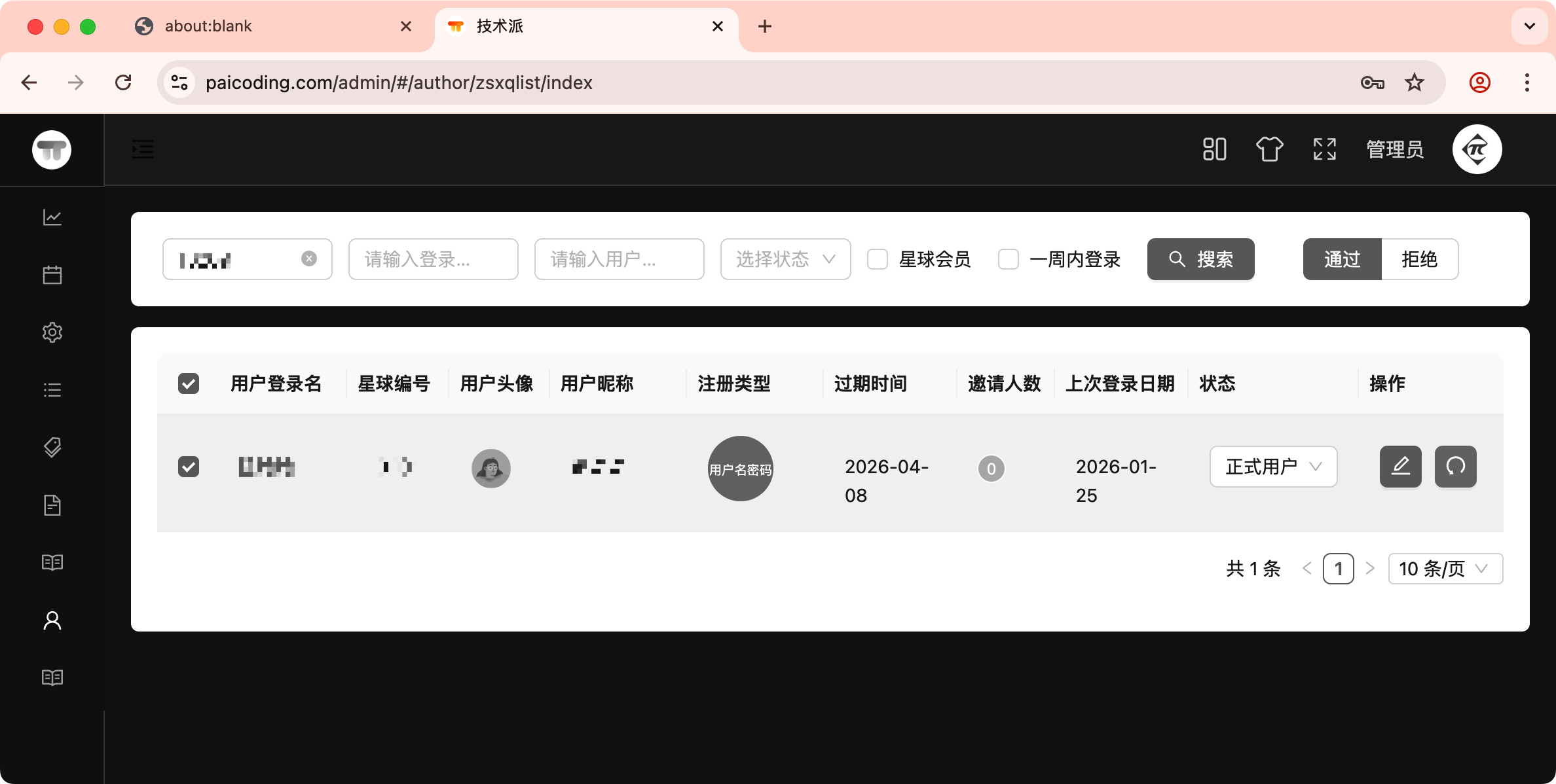 2. 去 paicoding.com/admin 登录admin账户和密码,如果已经登录就不需要再登录了,然后进入星球白名单页面,在试用中的列表中,对照星球编号,然后审核通过。
