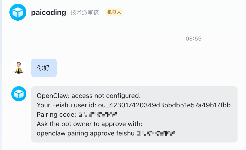 打开飞书应用paicoding,然后随便输入一句话,这时候一般会回来一个配对密钥。