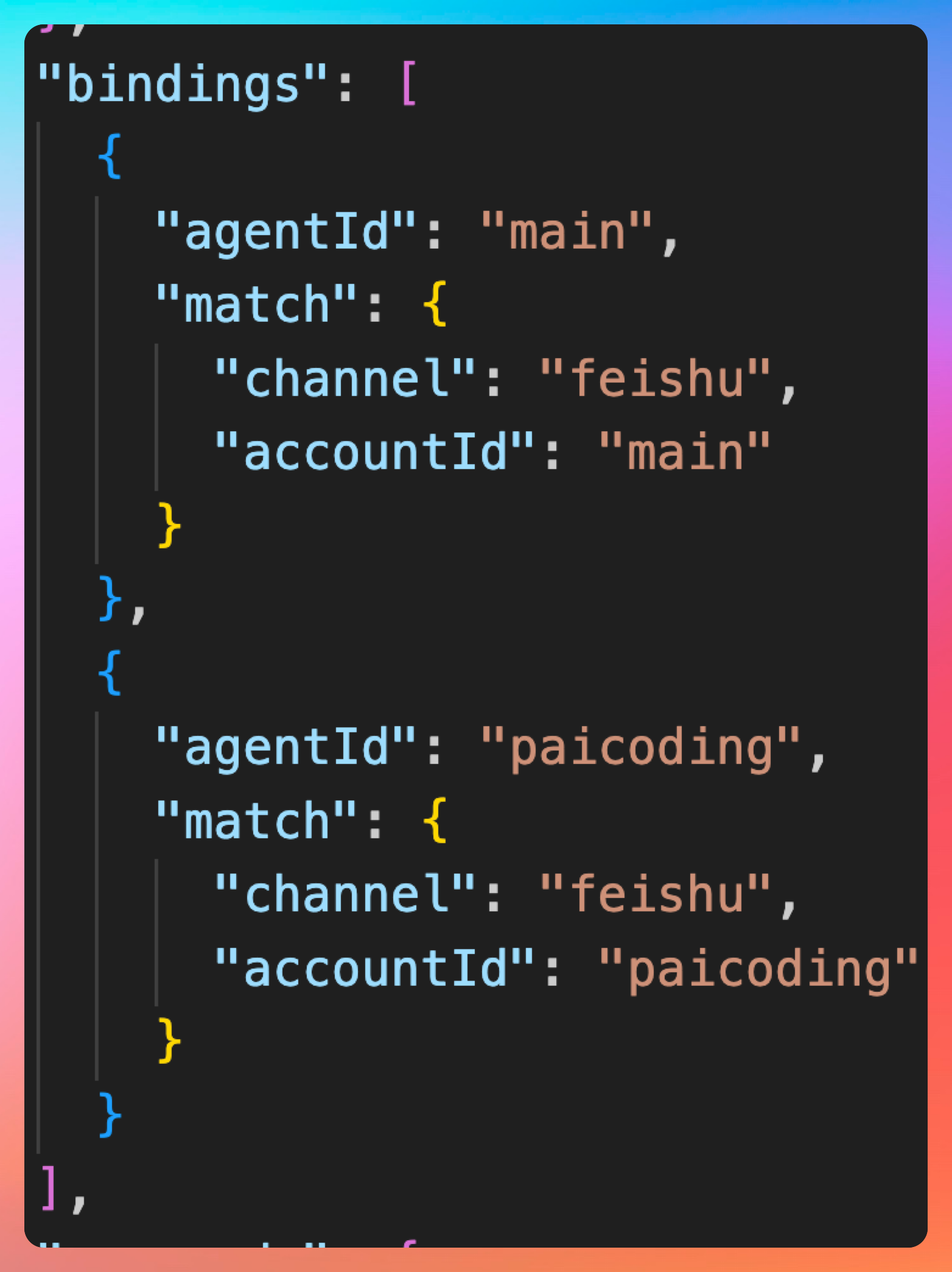 第三步:配置 bindings,把 paicoding 绑到新飞书应用