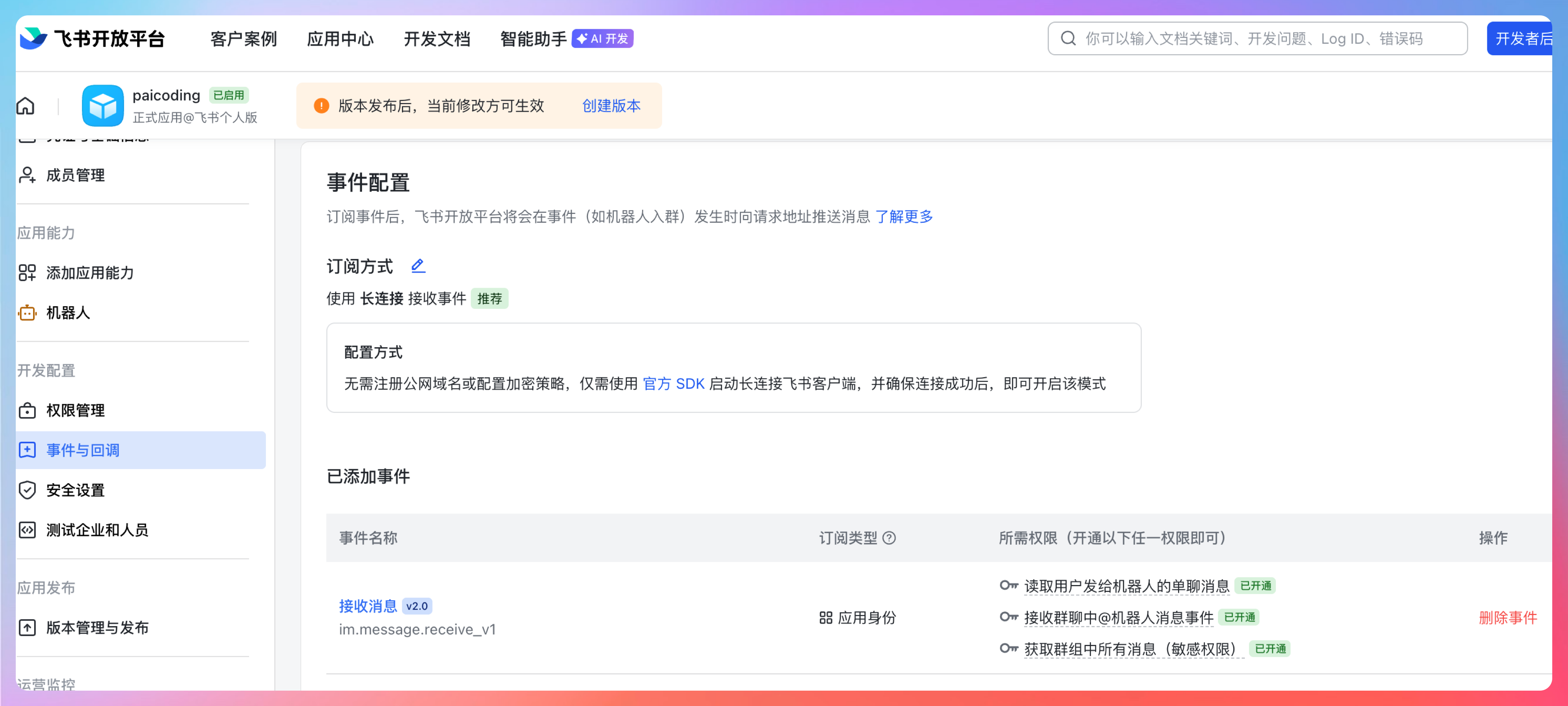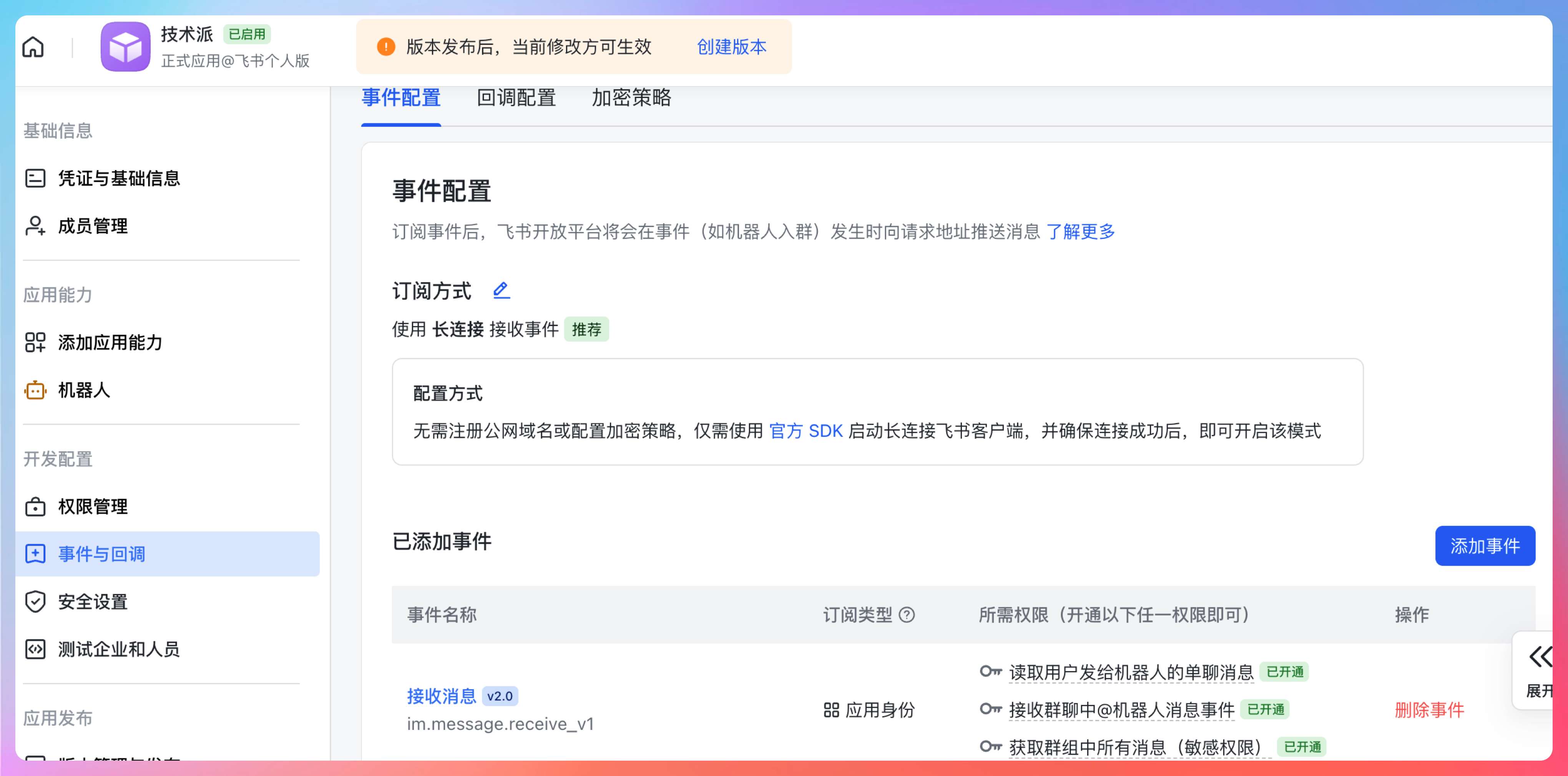 回到飞书,配置订阅方式为长连接,并添加 im.message.receive_v1 事件。
