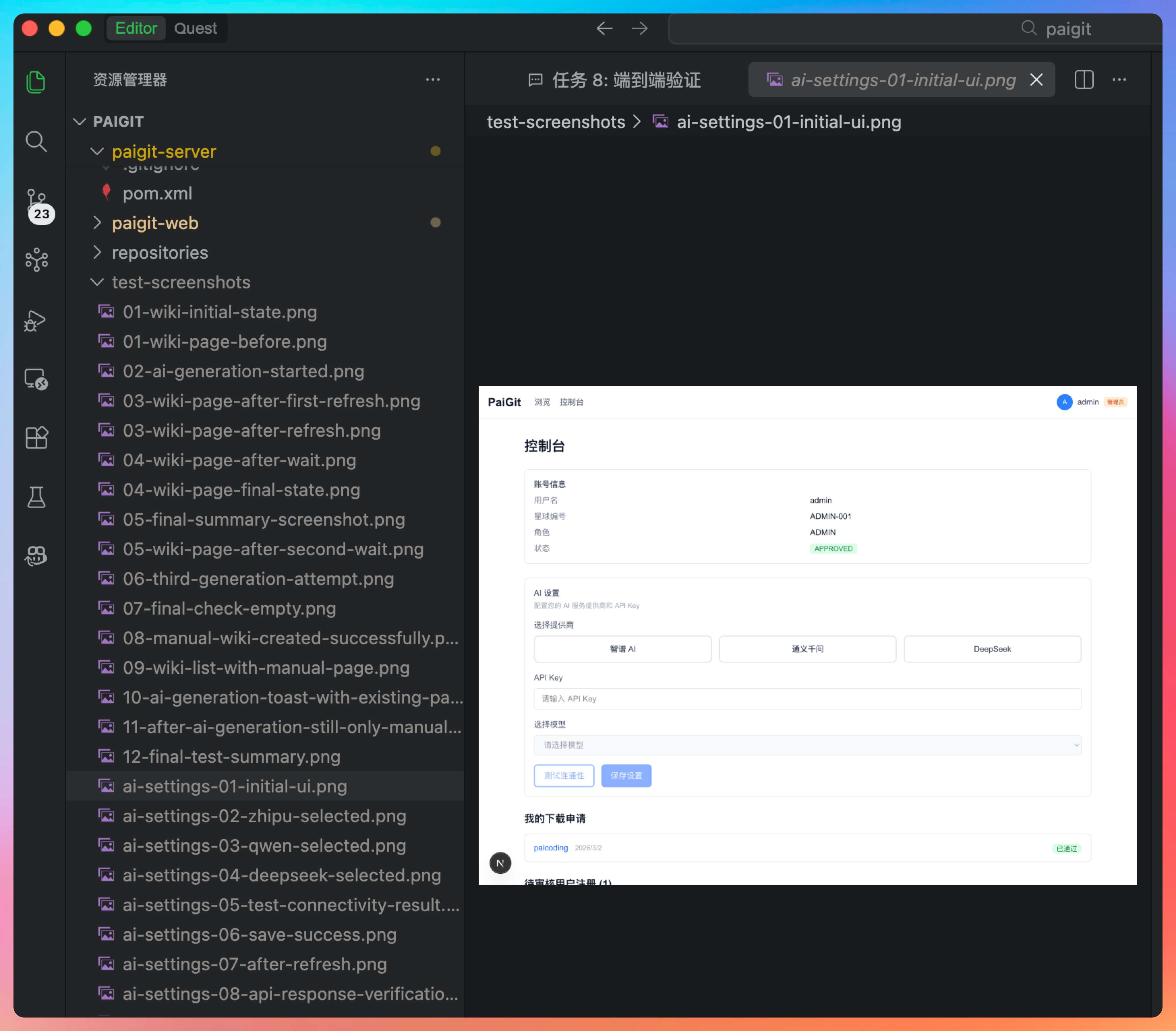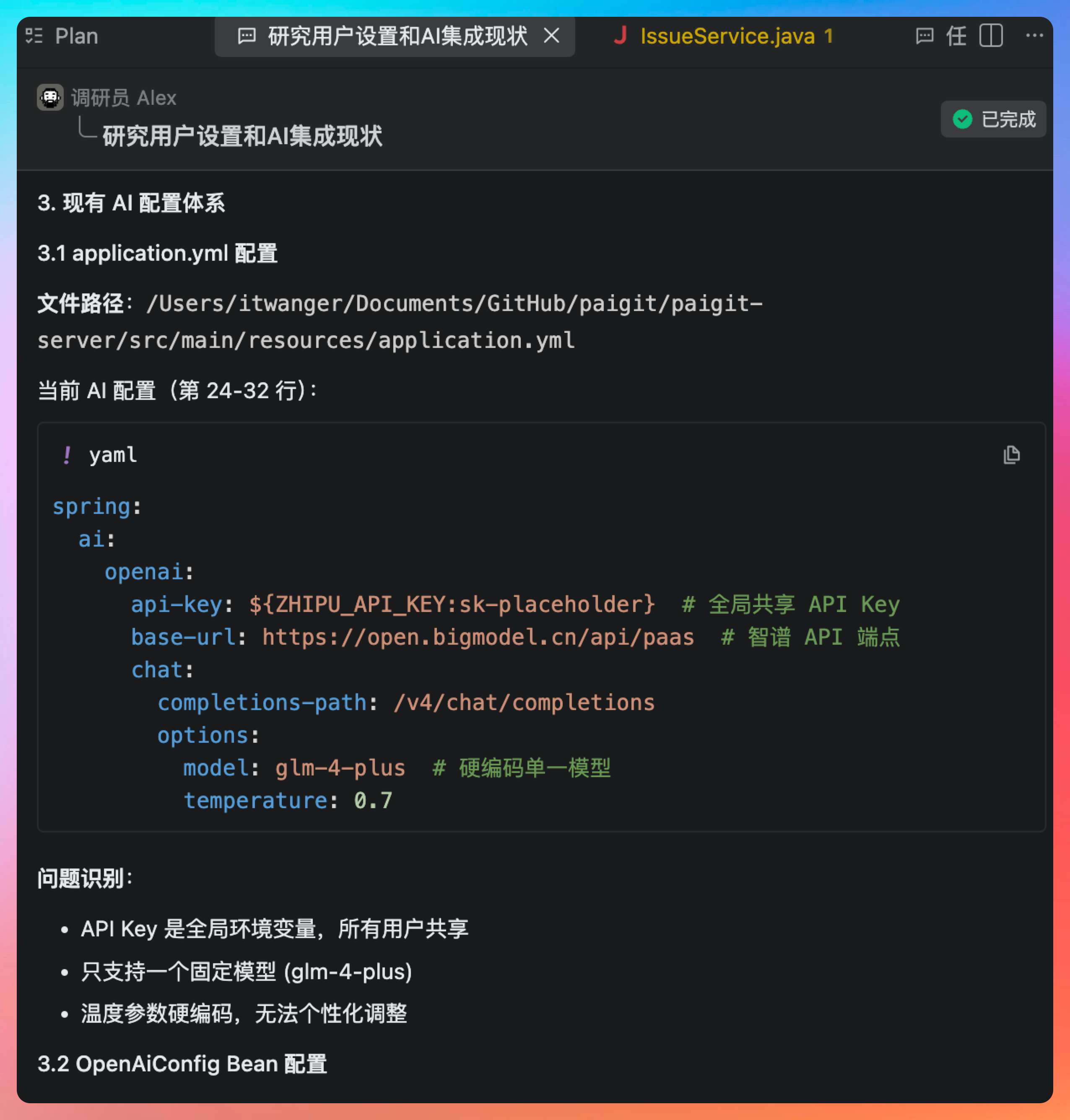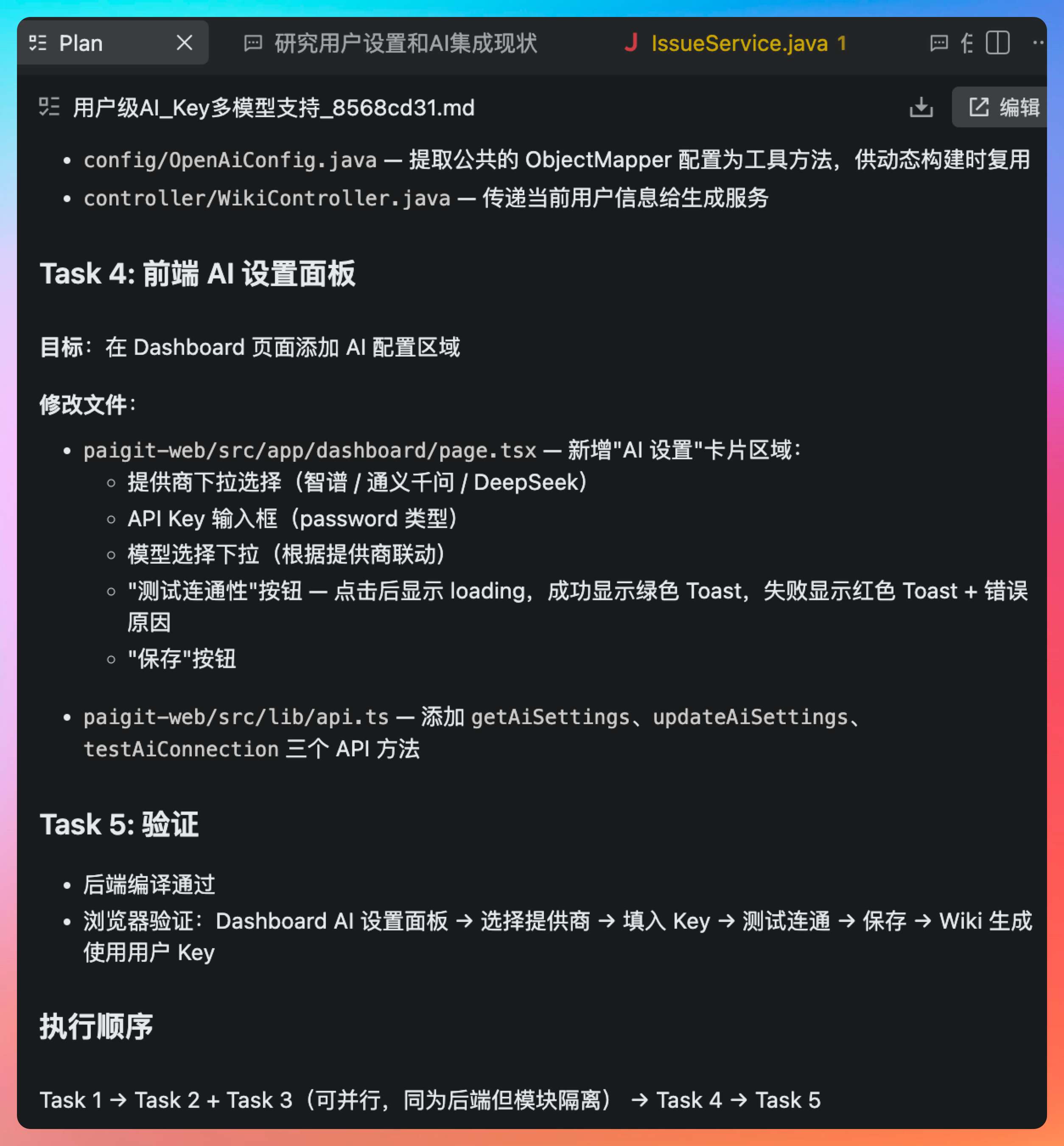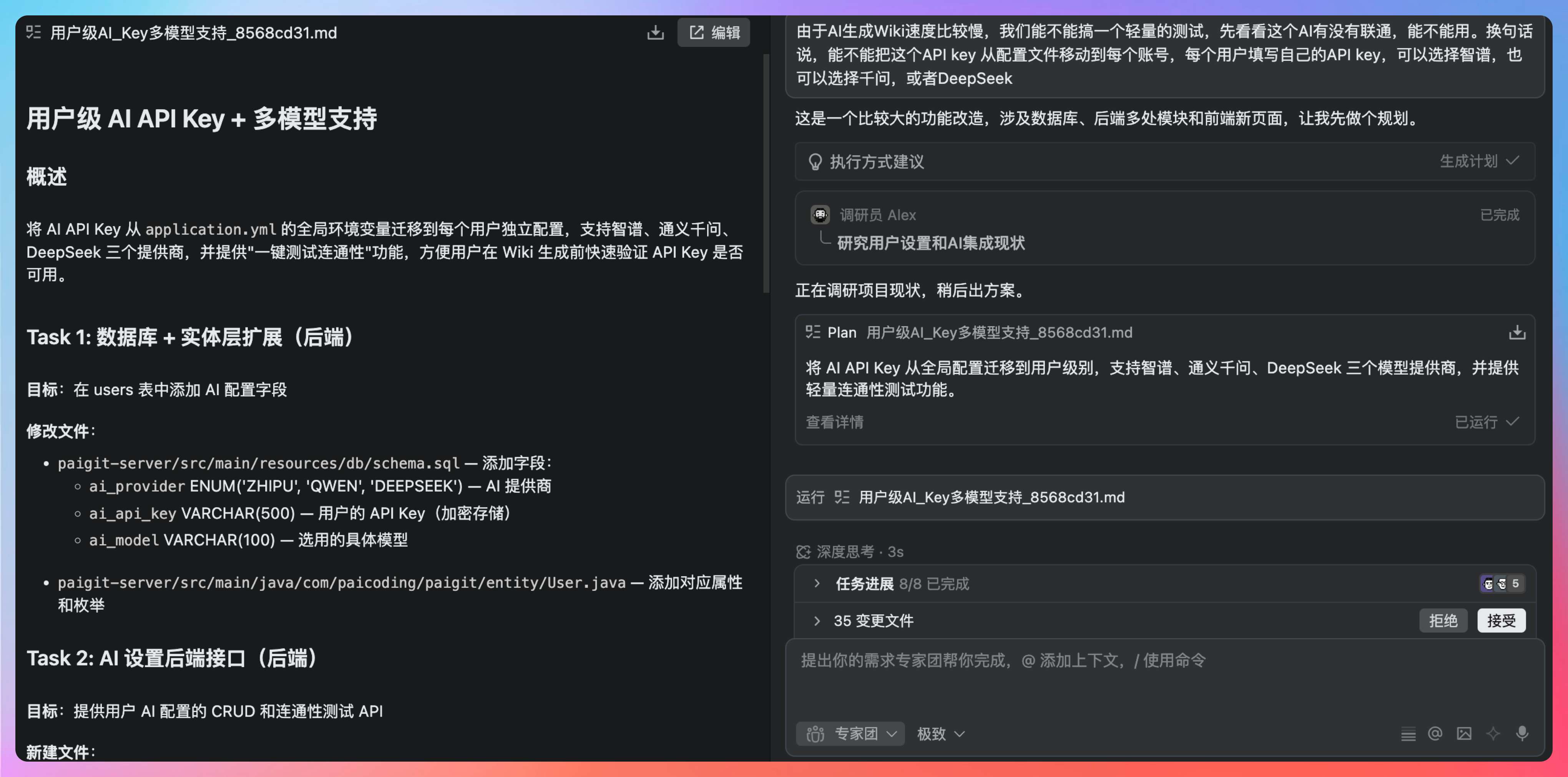 于是我这次换了一个更有挑战性的任务——让 PaiAgent 开发一个大模型 API key 接入功能,给每个用户使用,这样在使用 Wiki 功能的时候,就可以用自己的套餐。