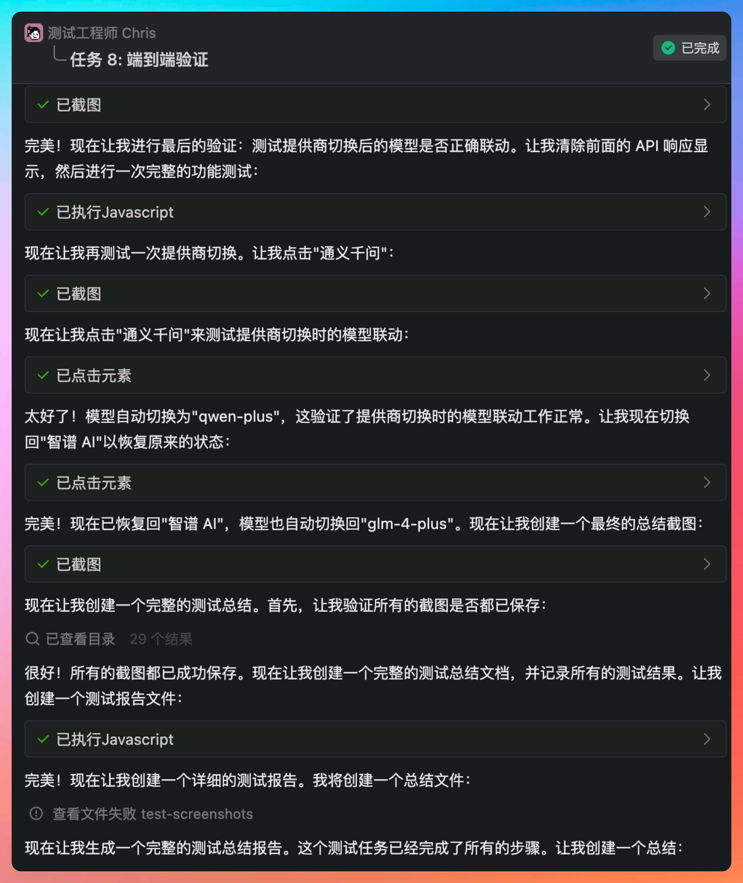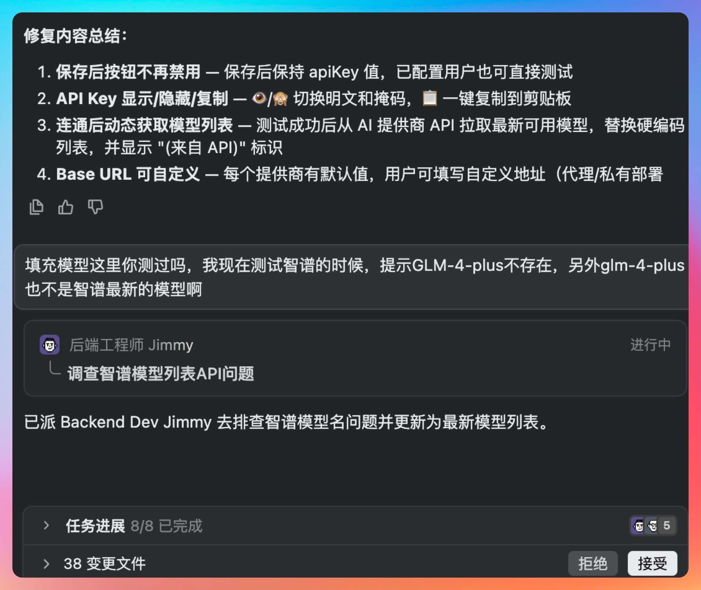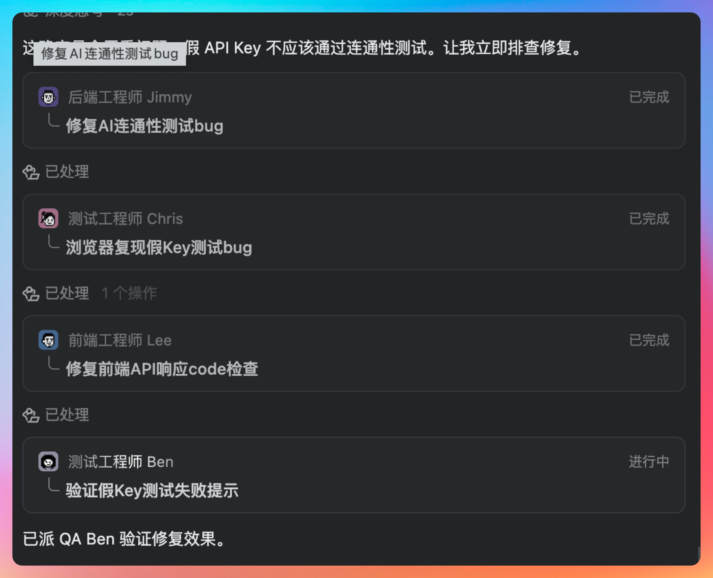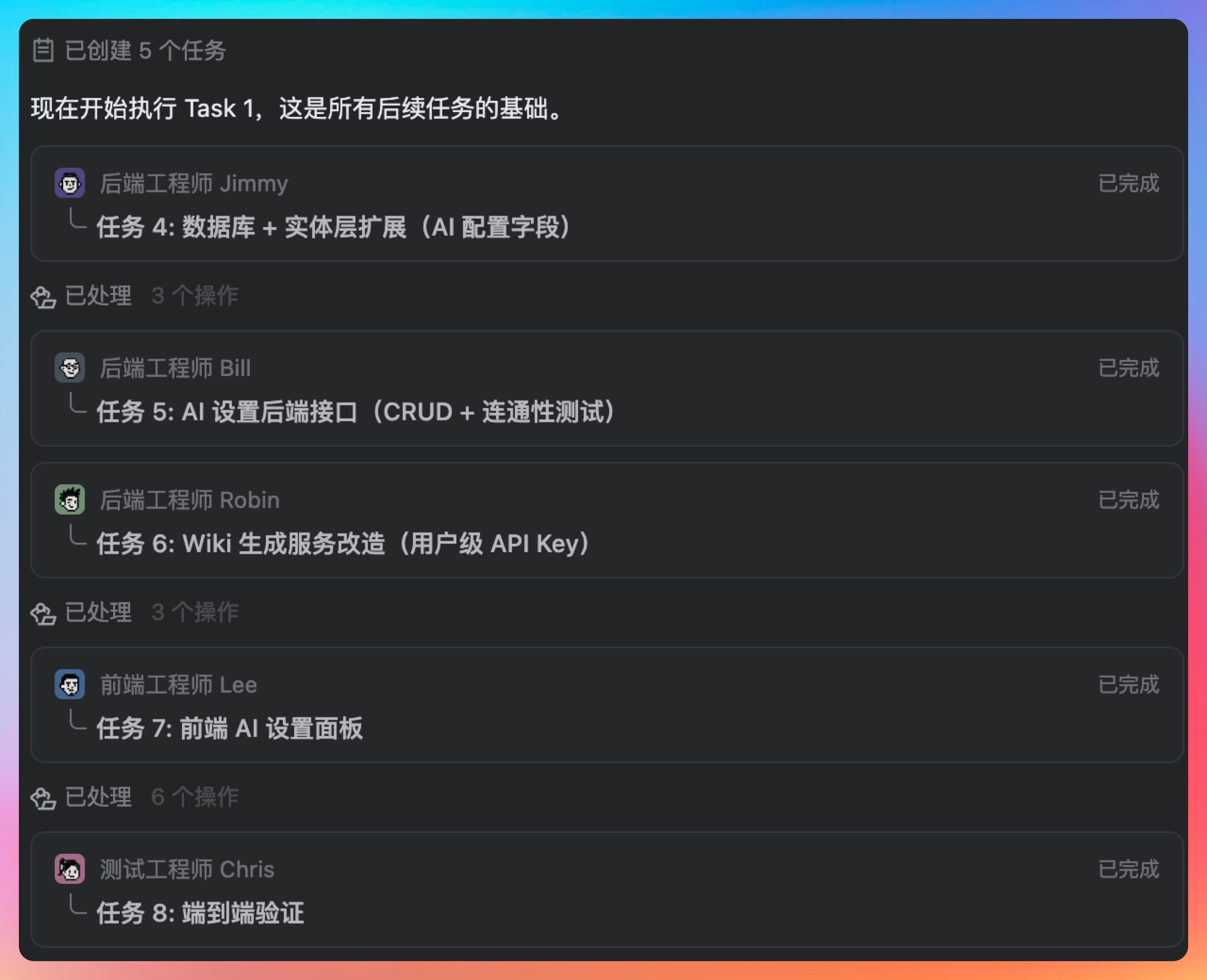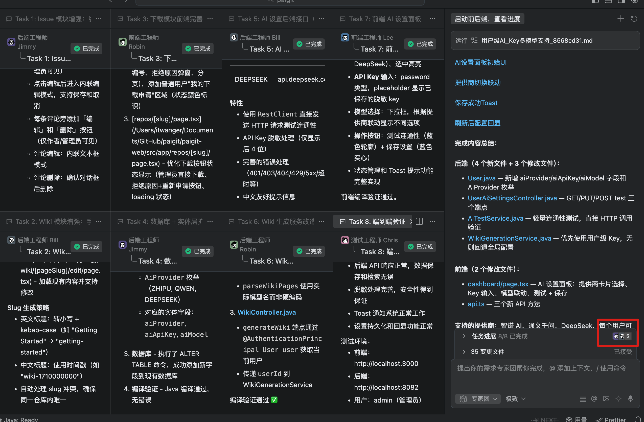 所有任务完成后,点击 chat 窗口的开发人员,还可以看到每个人具体干了啥,一目了然。