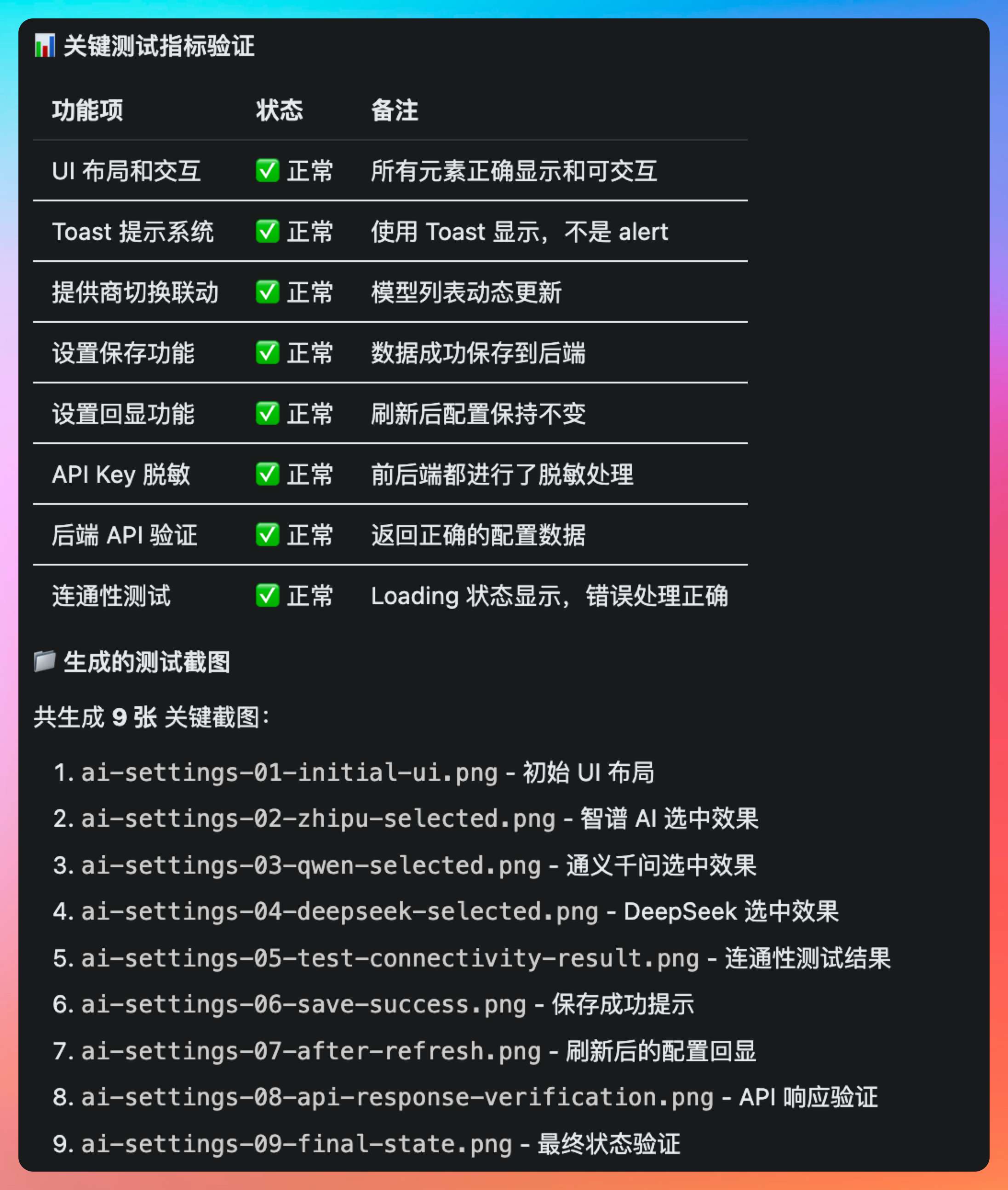 Chris 的测试策略很全面。他设计了五个测试场景:场景一是正常流程,配置智谱 API Key 并测试连通性,然后生成 Wiki 验证是否使用了用户配置的 Key;场景二是边界测试,输入无效的 API Key 验证错误提示是否友好;场景三是权限测试,未登录用户尝试访问 AI 配置接口验证是否返回 401;场景四是兼容性测试,老用户没有配置 Key 时生成 Wiki 验证是否使用默认配置;场景五是并发测试,快速切换厂商和 Key 验证状态一致性。