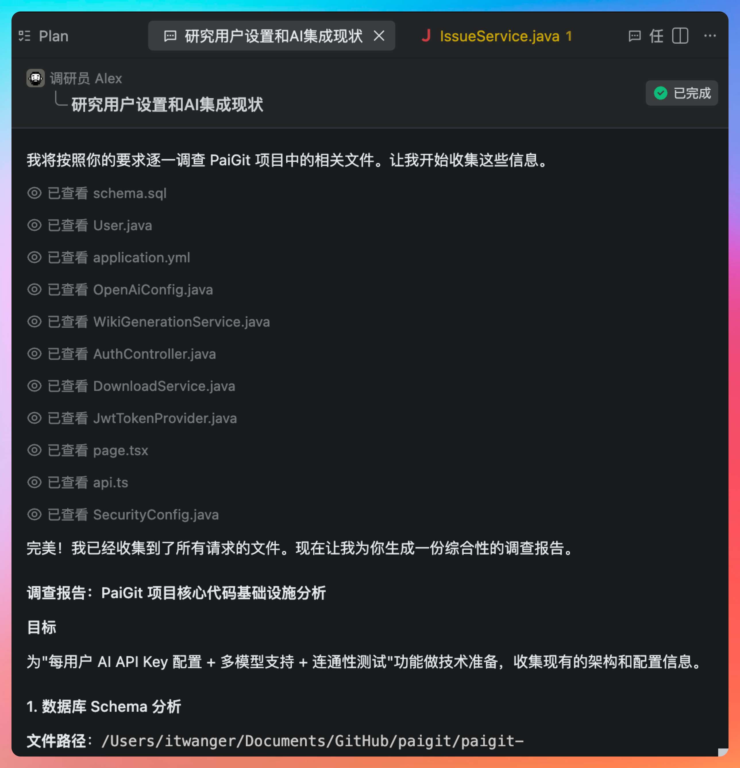 注意,每次有新的需求,Qoder 的 Experts Mode 都会先让调查员 Alex 进来深入调查一番。