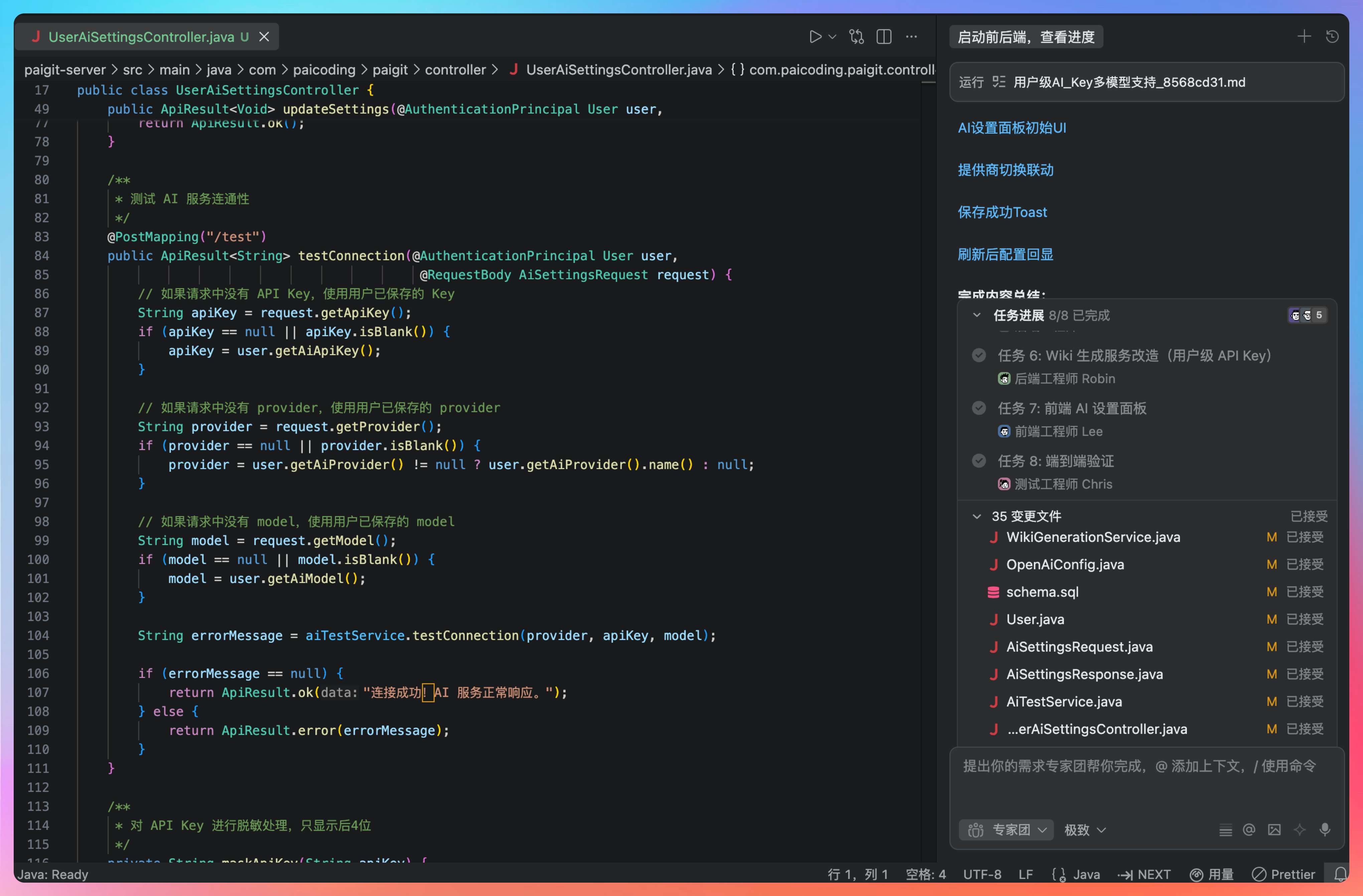 比如“用户没配 API Key 怎么办”“老逻辑是否兼容”“测试接口要不要真的打三家模型厂商”“前端提示信息要不要体现加密存储”这些问题,严格来说我在需求里都没有说死。但 Qoder 没有装作没看见,而是会在拆解阶段把这些问题变成设计决策。