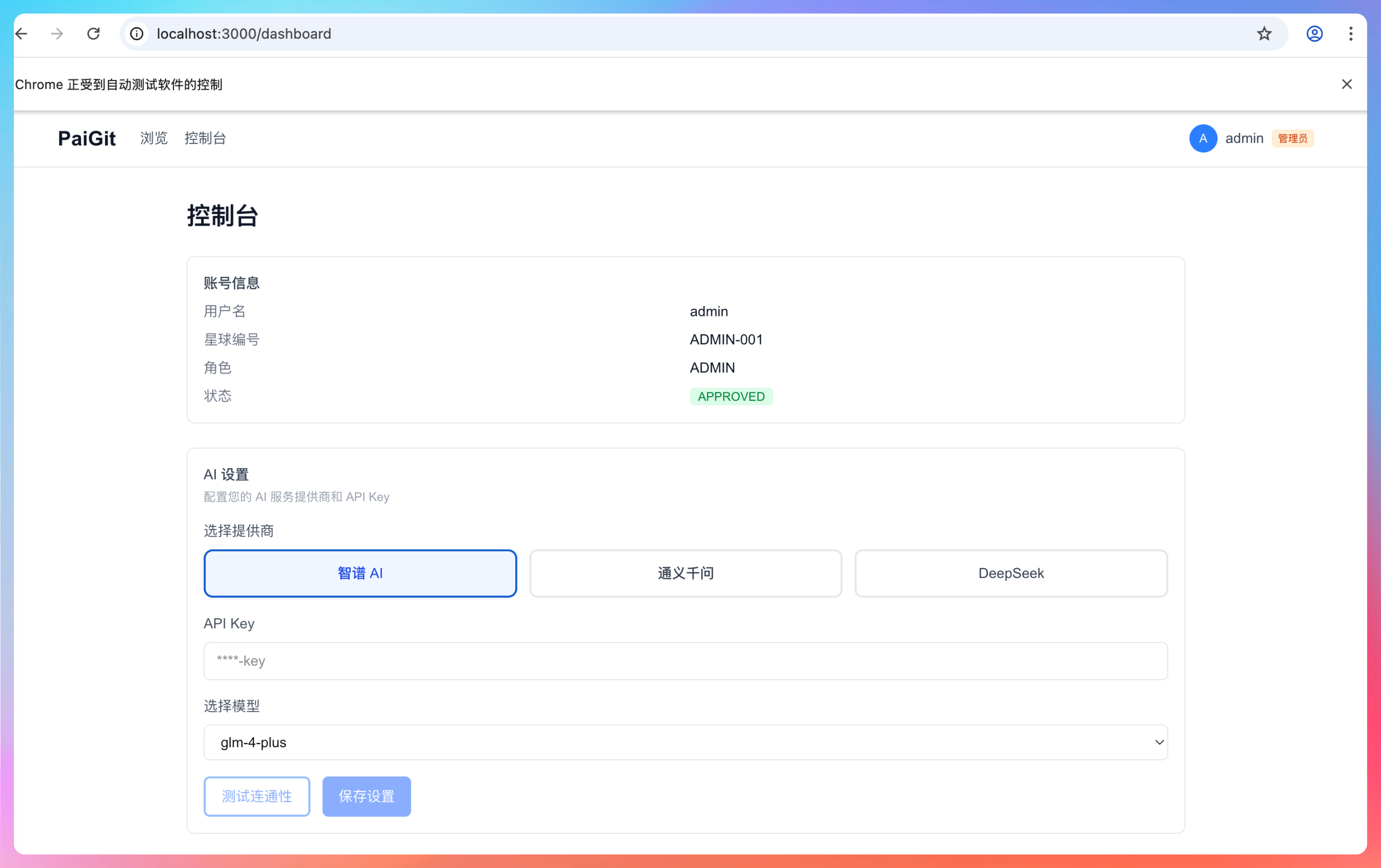 由于 AI 生成 Wiki 速度比较慢,我们能不能搞一个轻量的测试,先看看这个 AI 有没有联通,能不能用。换句话说,能不能把这个 API key 从配置文件移动到每个账号,每个用户填写自己的 API key,可以选择智谱,也可以选择千问,或者 DeepSeek
