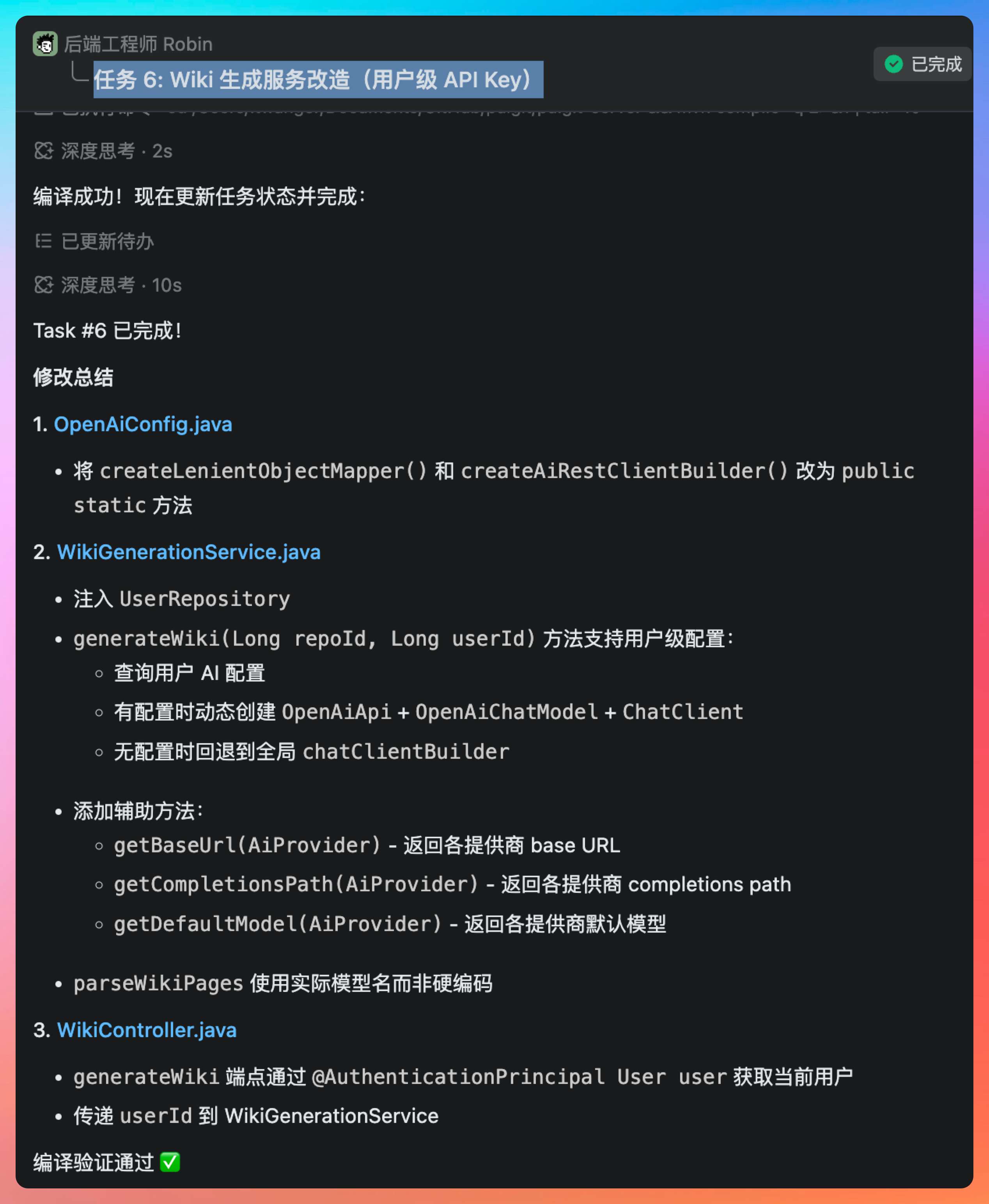 后端工程师 Robin 负责任务 3:Wiki 生成服务改造(用户级 API Key)。
