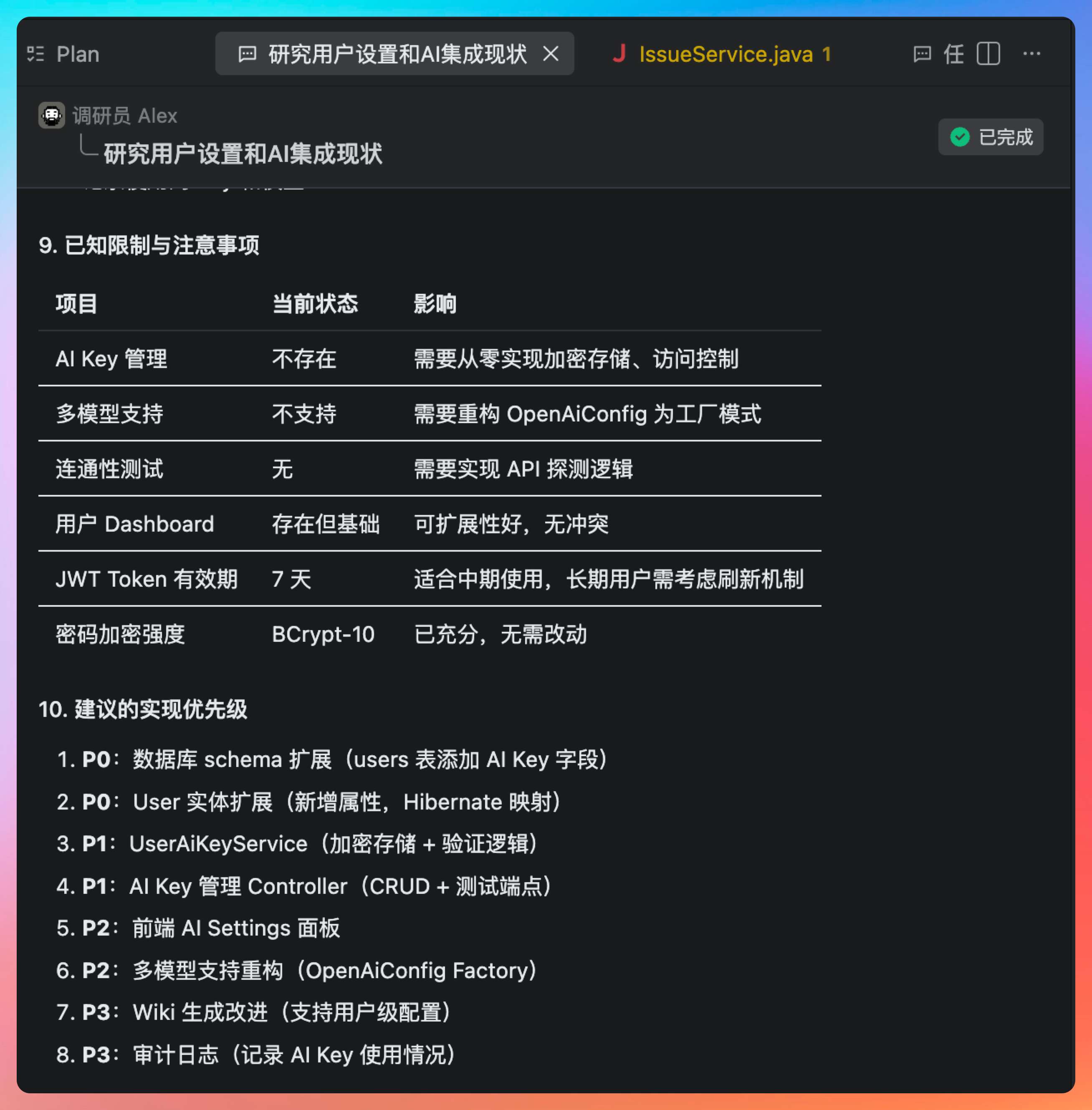 - P1:UserAiKeyService(加密存储 + 验证逻辑)