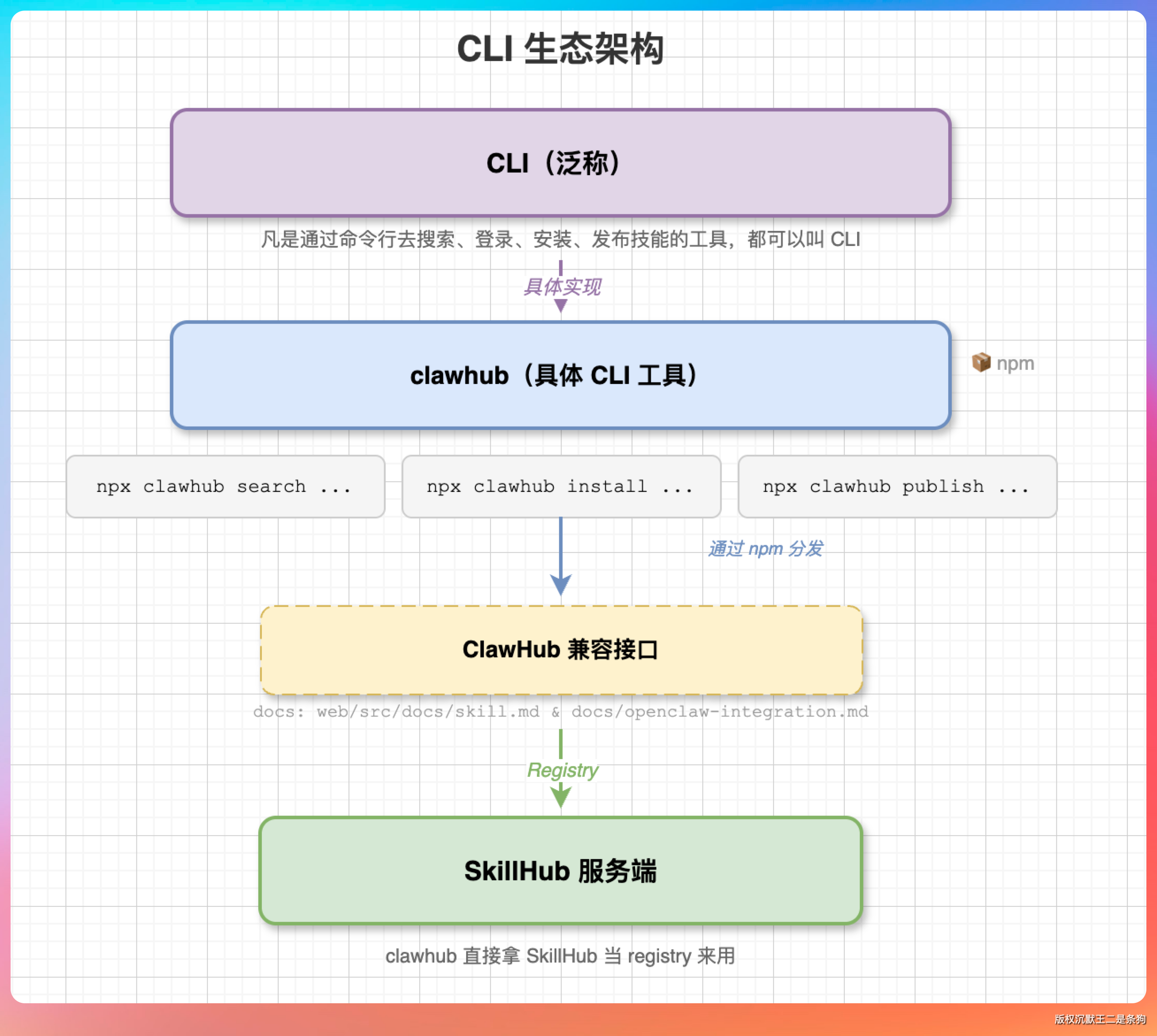 clawhub 是一个命令行客户端,也就是我们说的 CLI 工具。