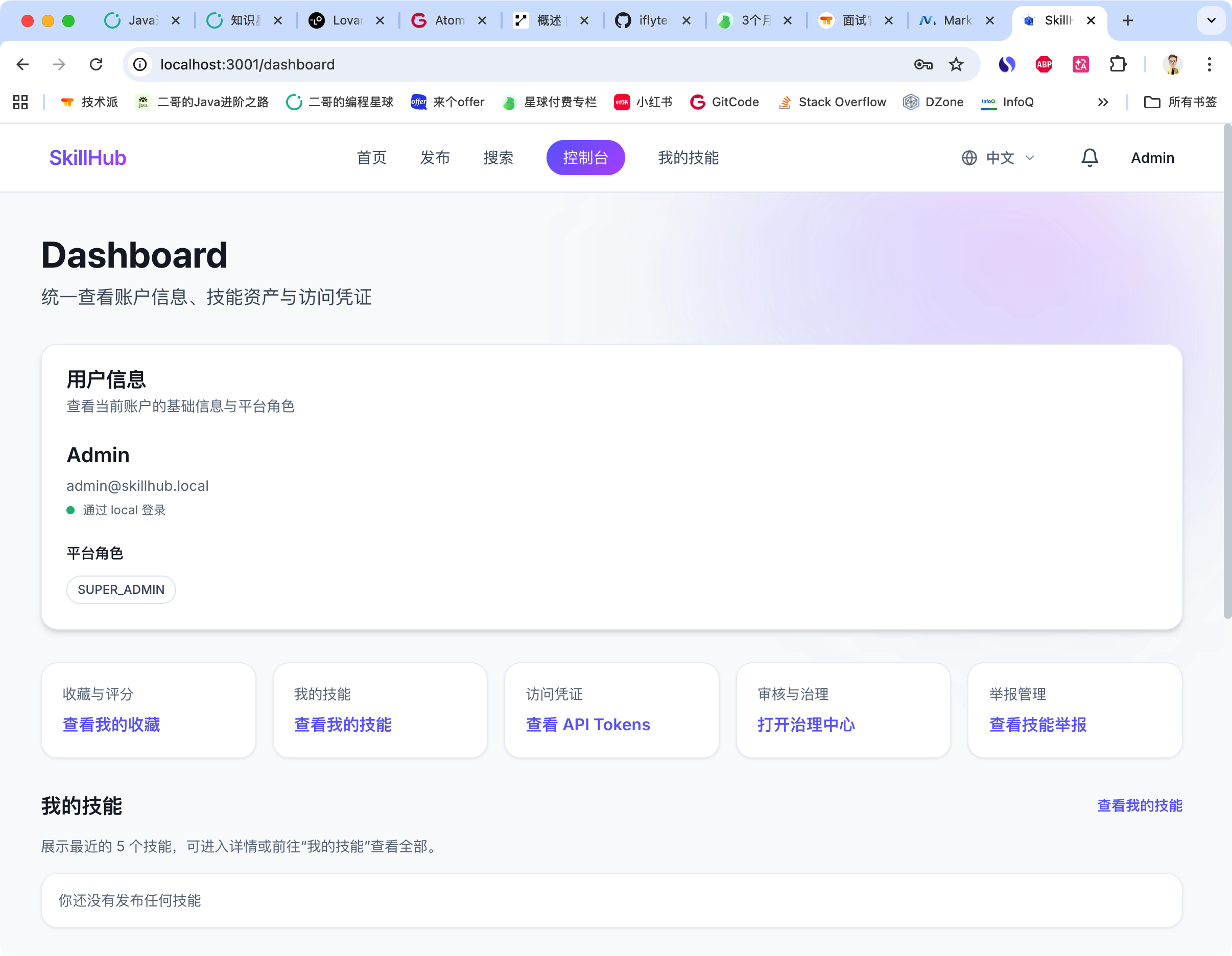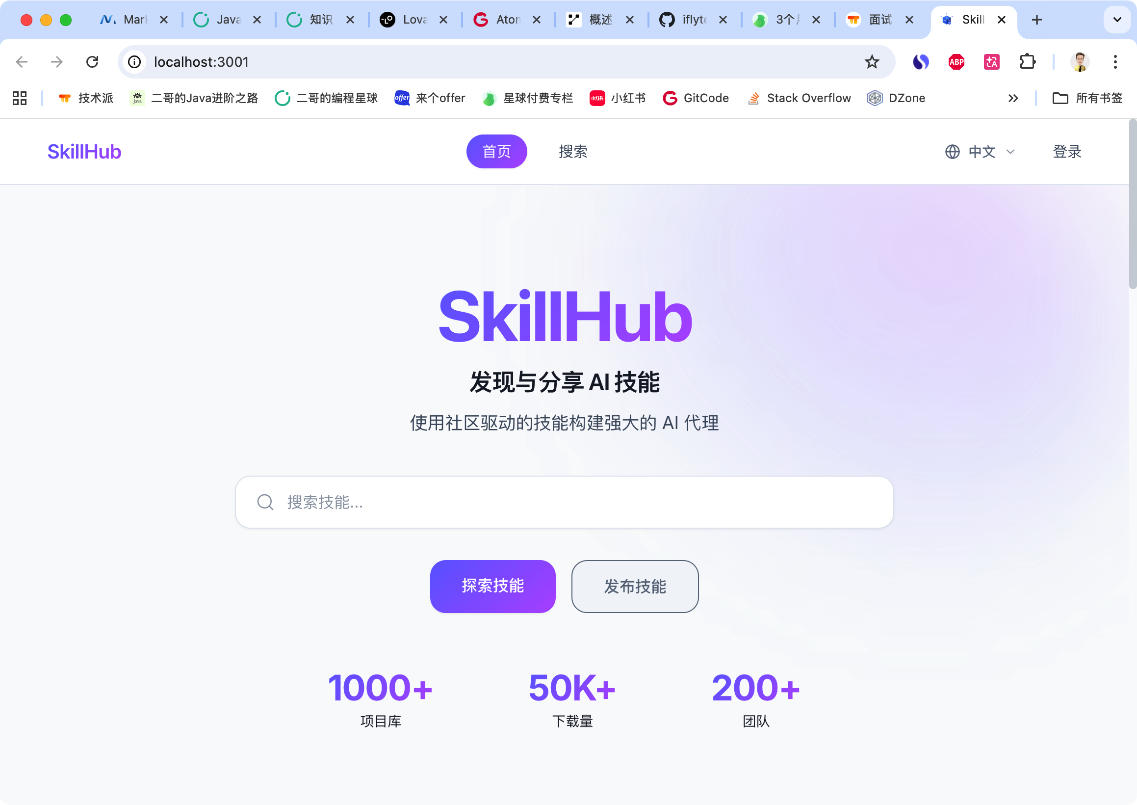 启动完成后,浏览器访问 http://localhost:3000,就能看到 SkillHub 的界面了。