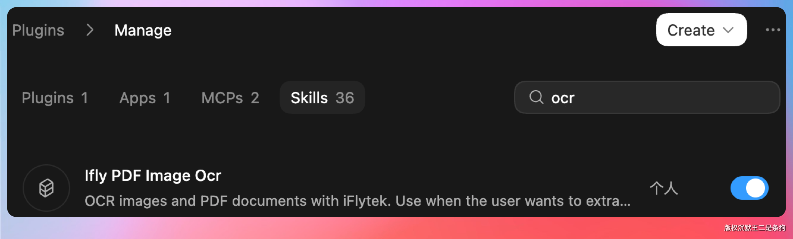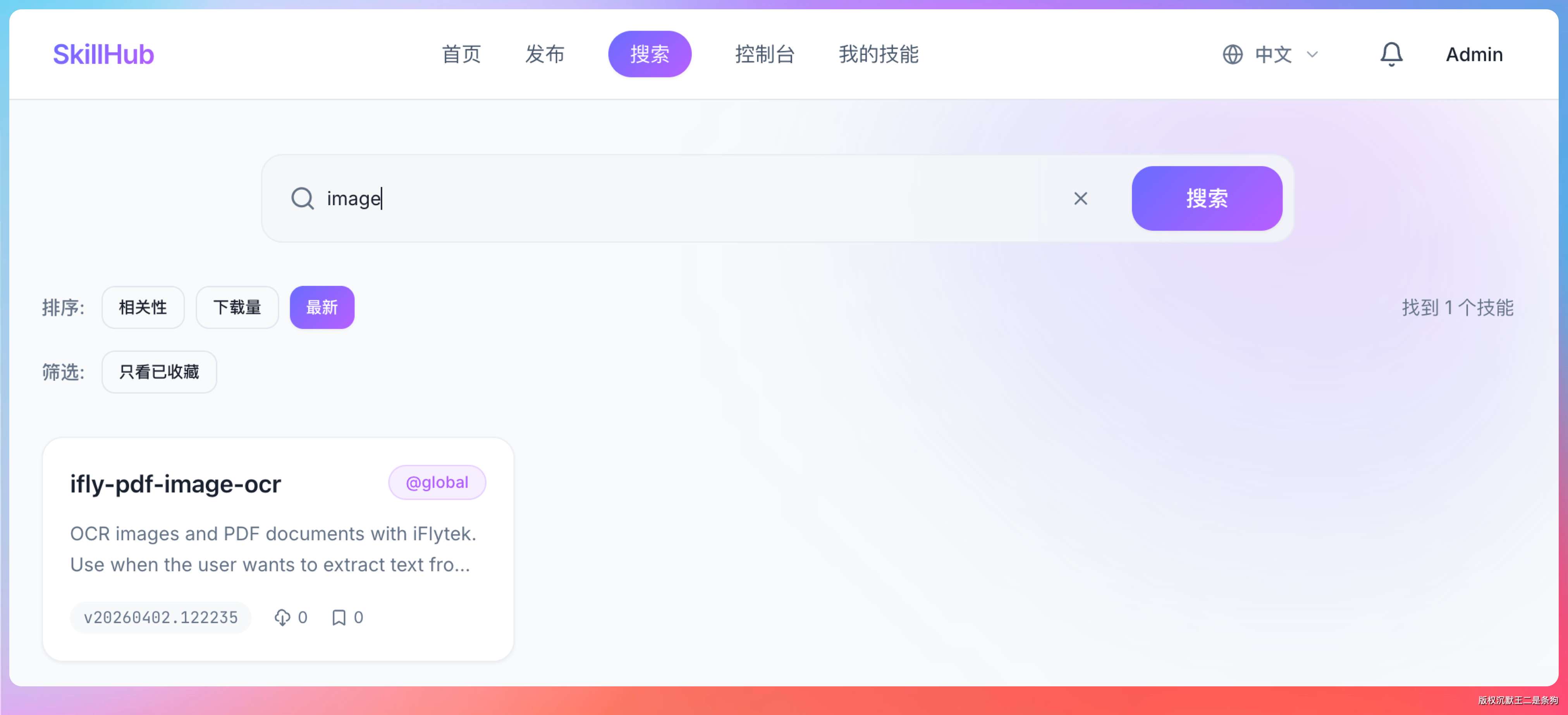 接下来,我演示几个最常见的动作。第一步是搜索技能。比如我已经上传了一个 OCR 相关的 skill,我可以直接搜索。