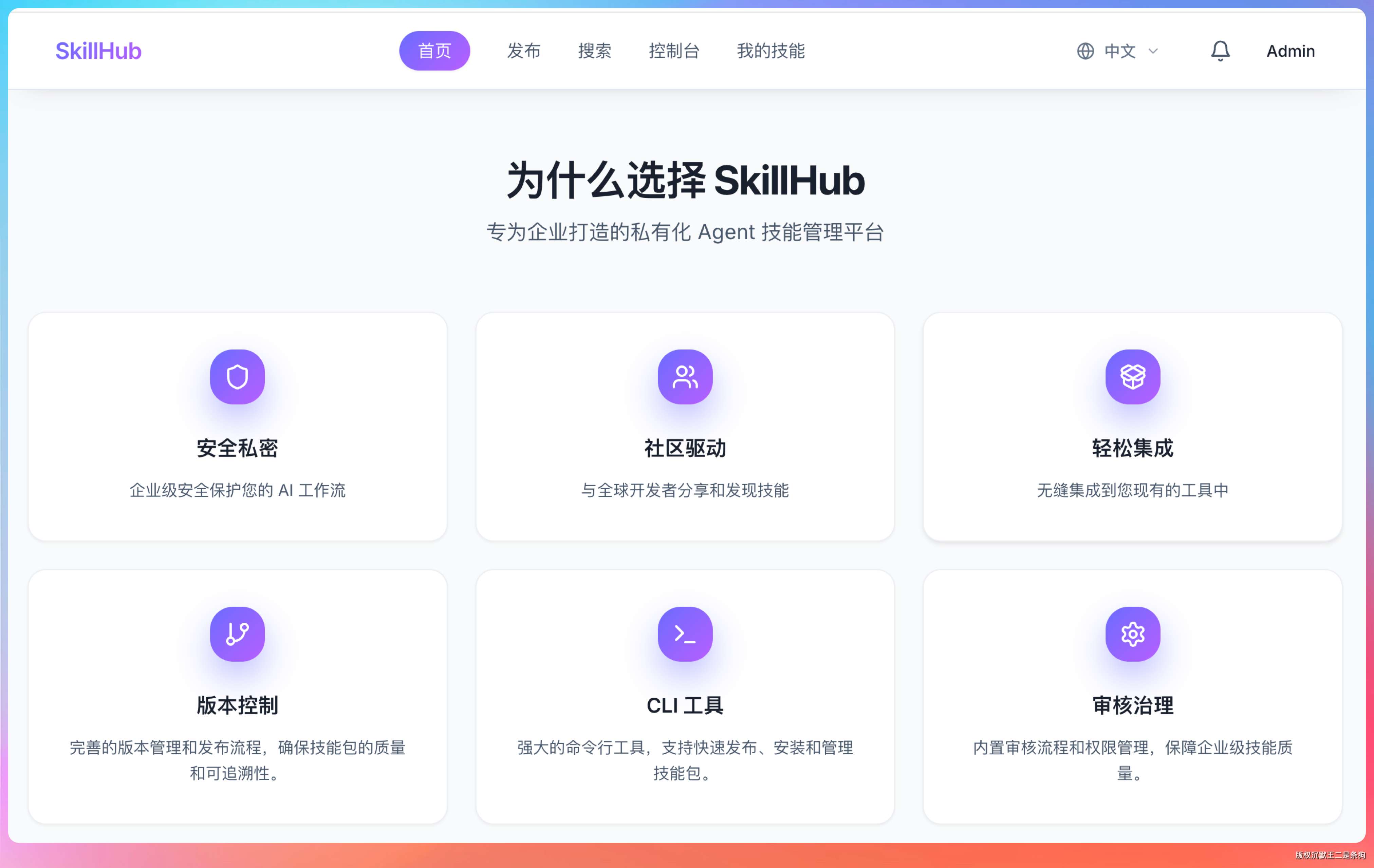 SkillHub 的核心功能可以概括为四个词:发布、发现、治理、集成。
