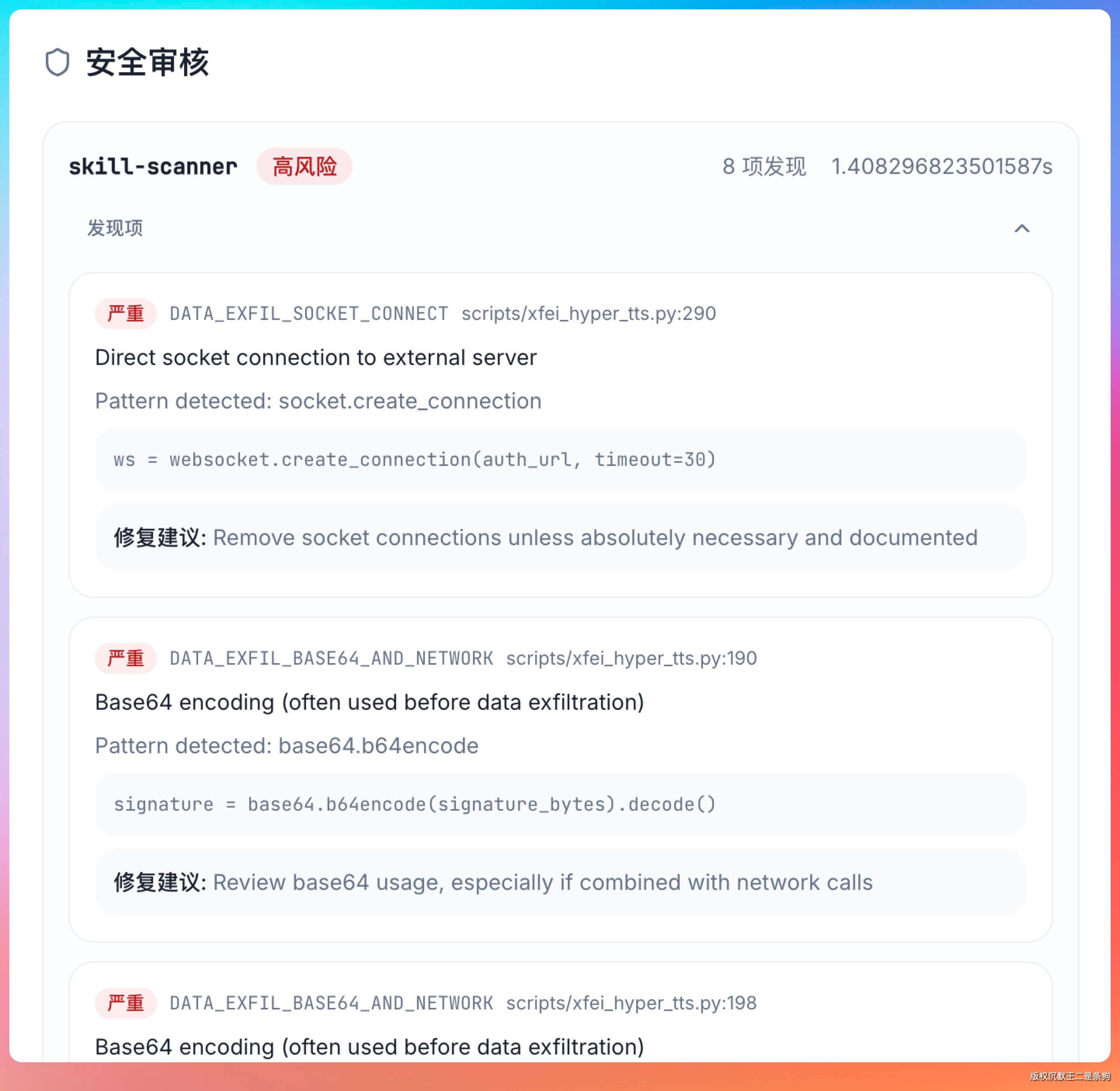 检查是否存在已知漏洞模式,比如命令注入风险、路径穿越风险、敏感信息硬编码等。如果发现问题,会在报告中标注风险等级(高/中/低)。