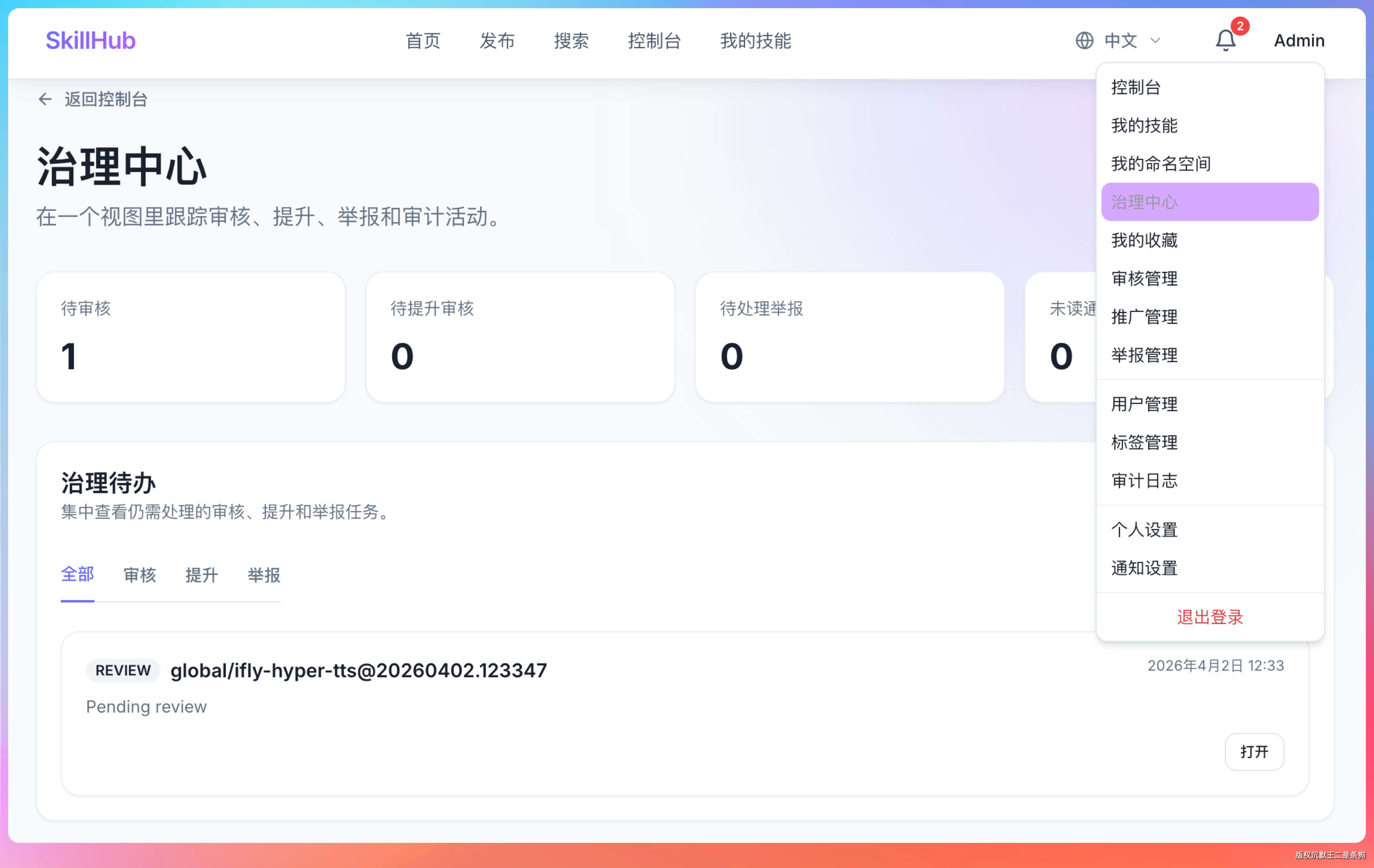 另外,SkillHub 还提供了完整的审核工作流: