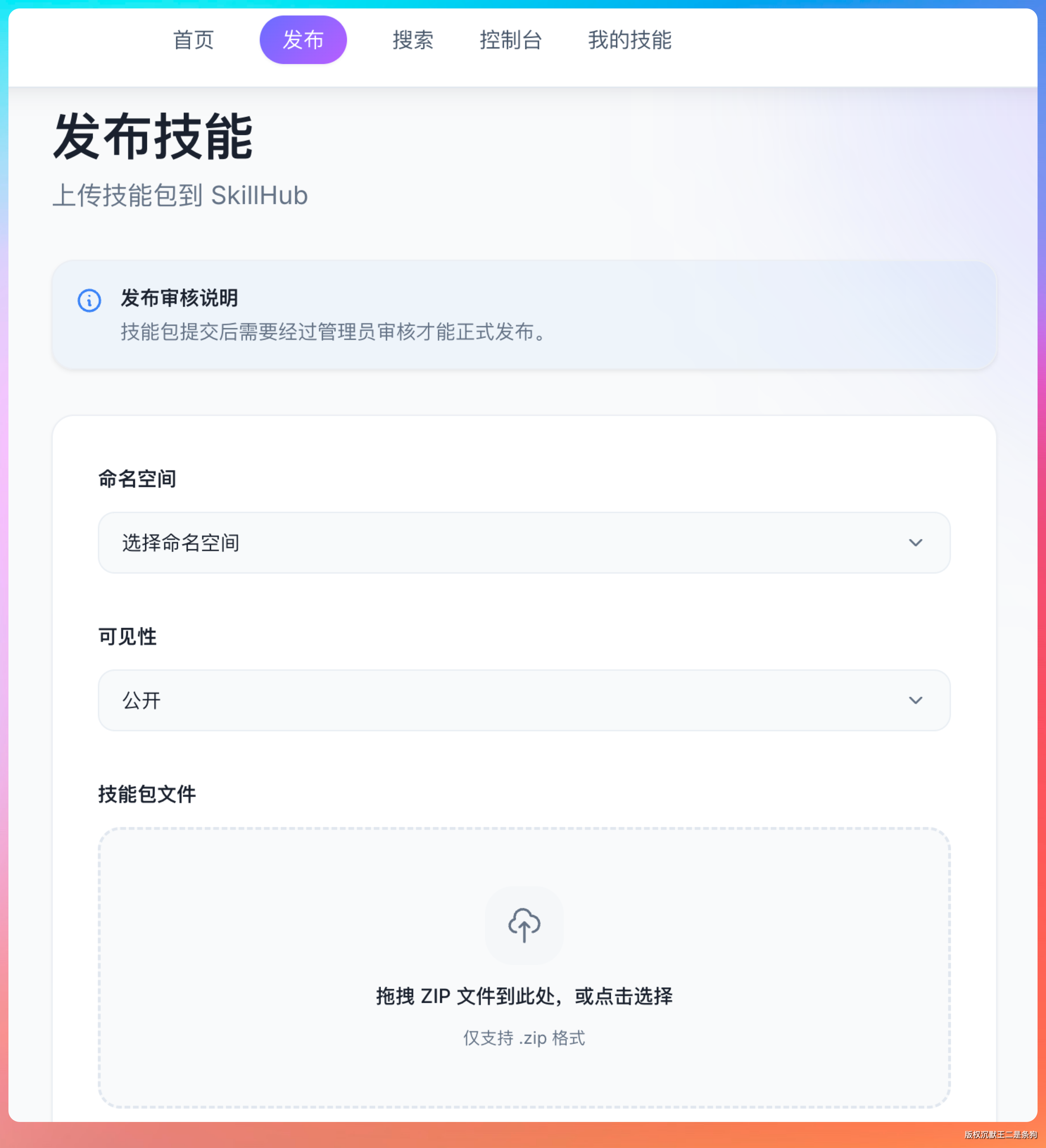 发布技能可以通过 Web 界面上传,也可以通过 CLI 工具。对于需要集成到 CI/CD 流程的场景,CLI 方式更合适。