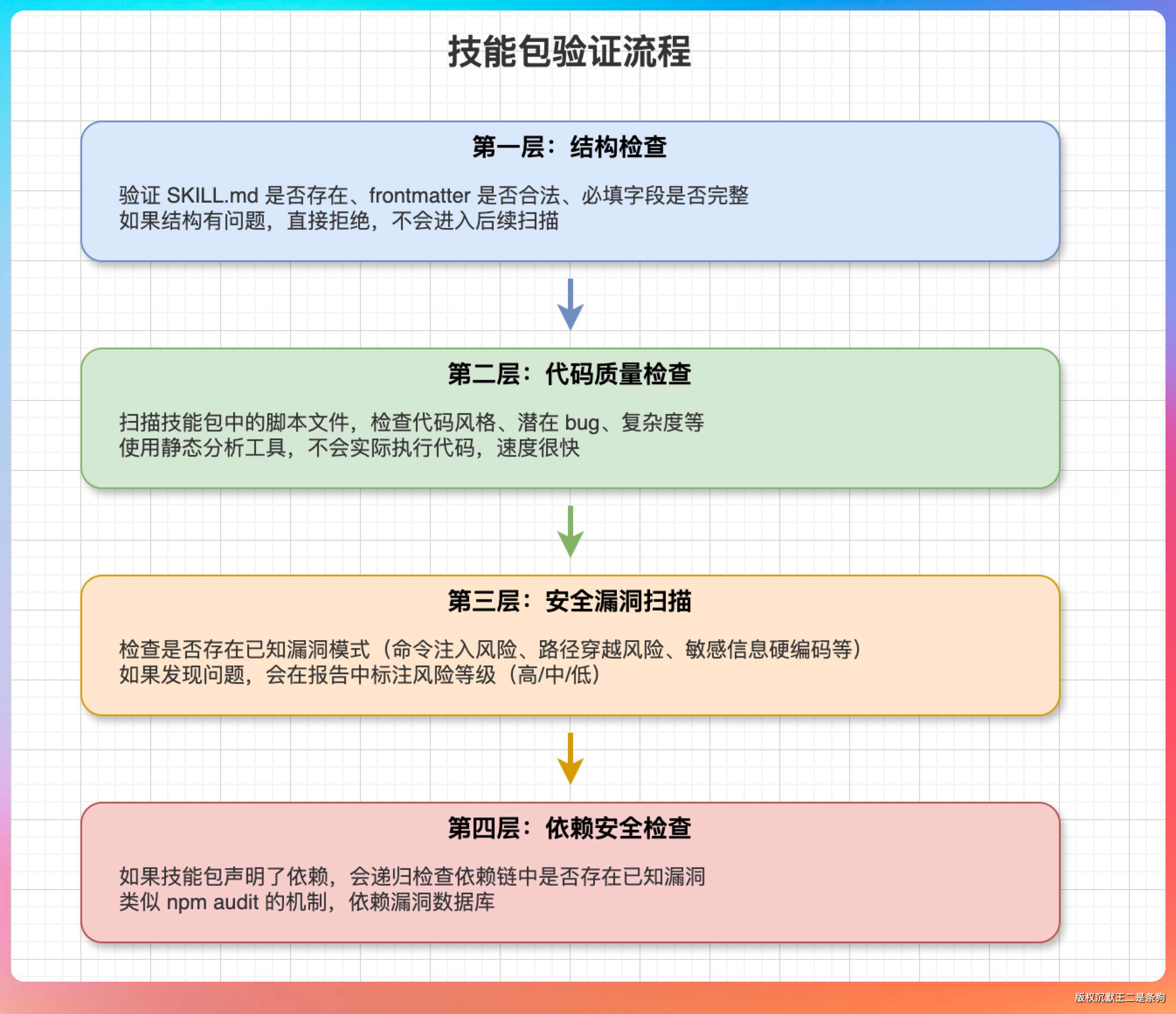 扫描技能包中的脚本文件,检查代码风格、潜在 bug、复杂度等。这一层用的是静态分析工具,不会实际执行代码,所以速度很快。