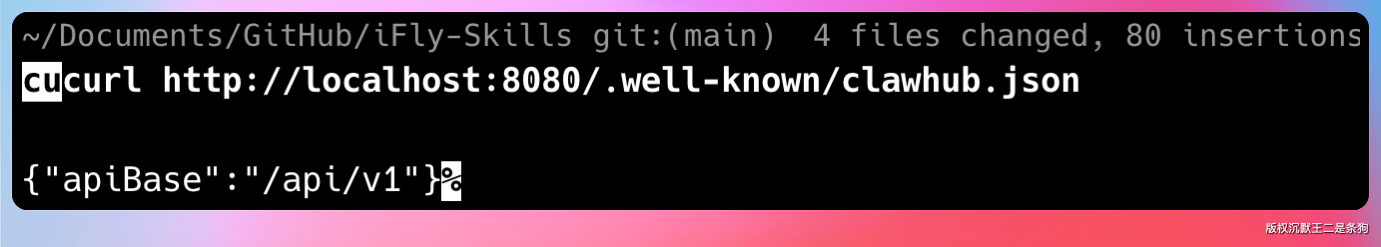 在进行 CLI 操作之前,我们先通过下面这行命令测一下 SkillHub 暴露的兼容发现端点。