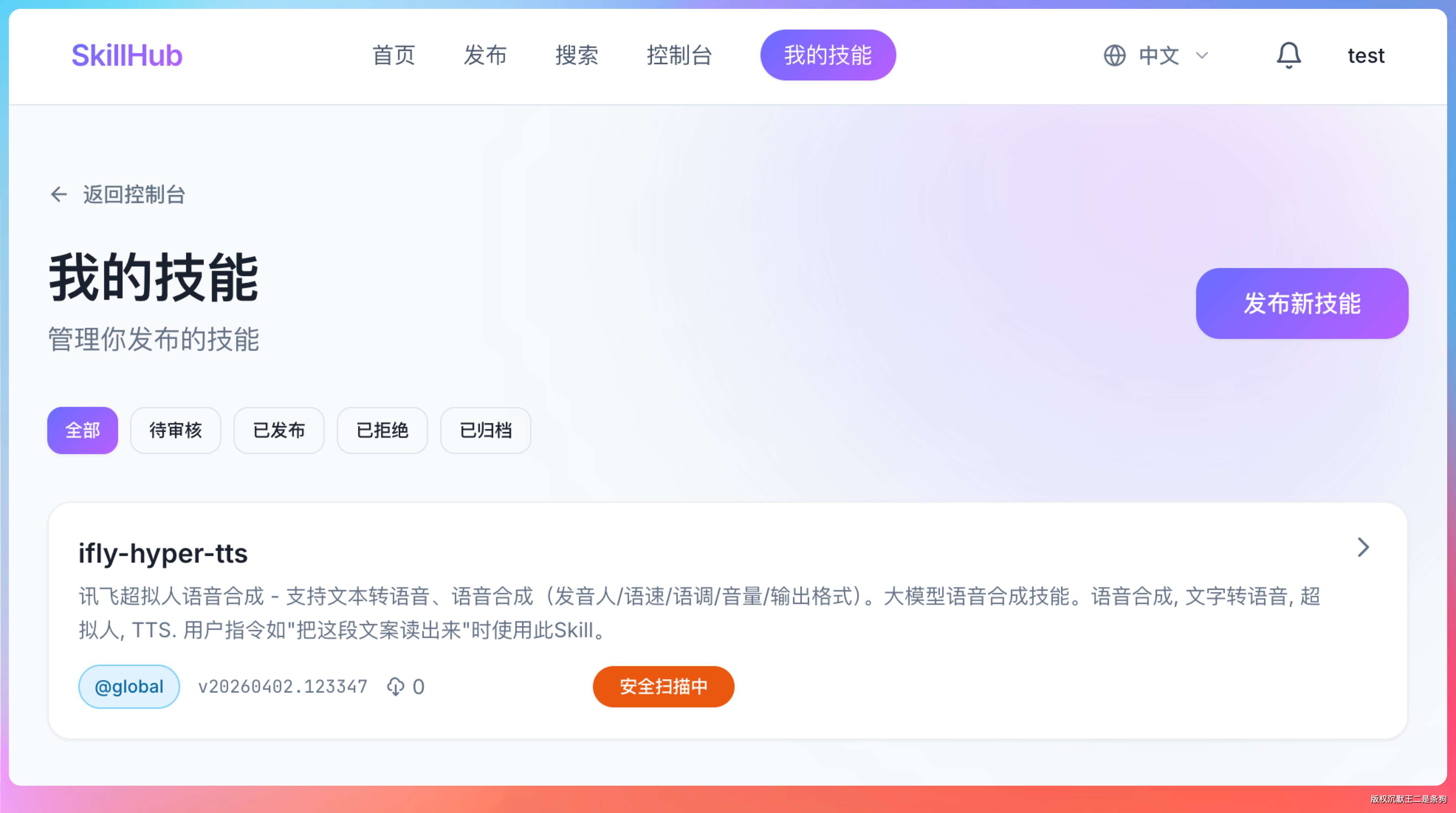 审核通过后,技能状态变为“已发布”,其他用户才能看到和下载。