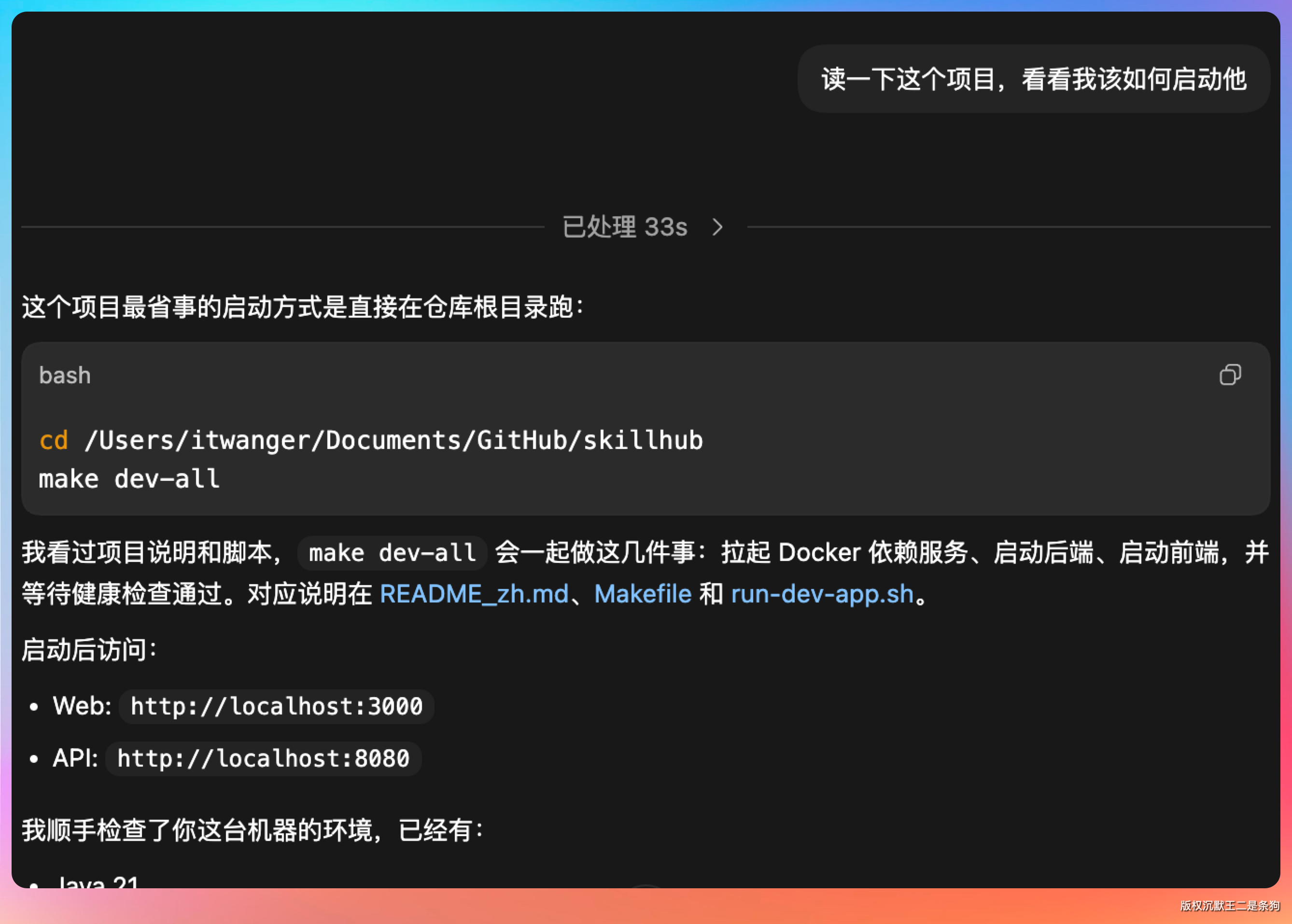 启动 Codex,让他帮我们读一下源码,然后引导我们怎么安装使用。