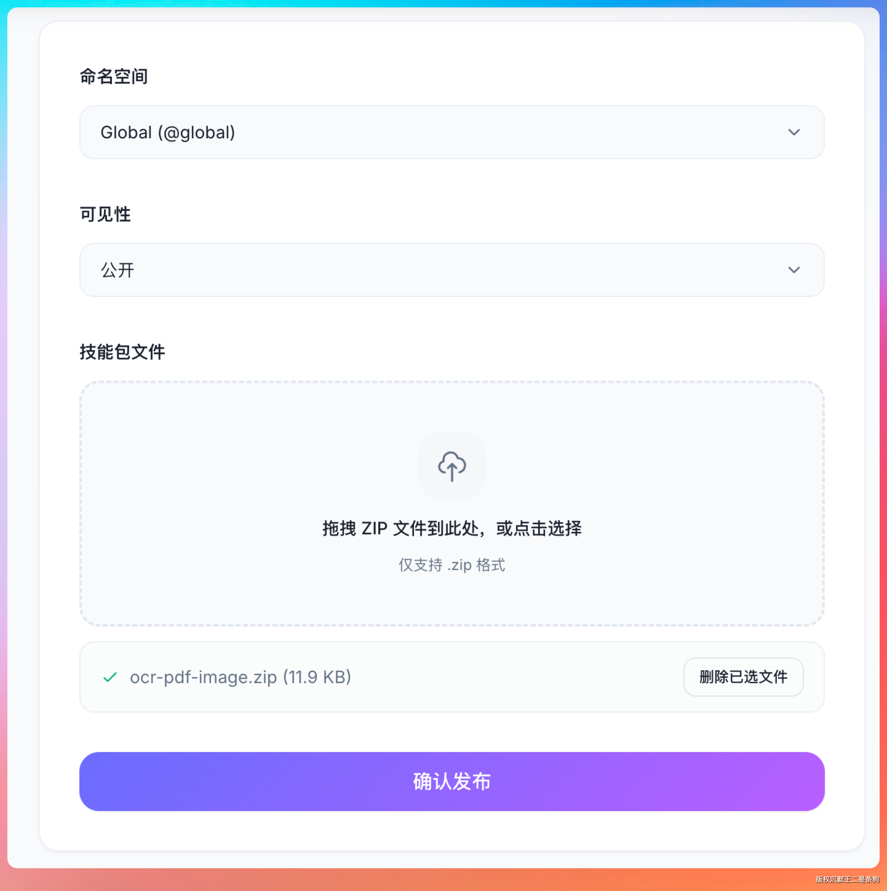 命名空间选择 global(企业内部可以选择对应的组织),技能的完整坐标格式是 @{namespace_slug}/{skill_slug},比如 @ai-team/code-review。这种命名方式借鉴了 npm 的 scoped package 设计,非常清晰。