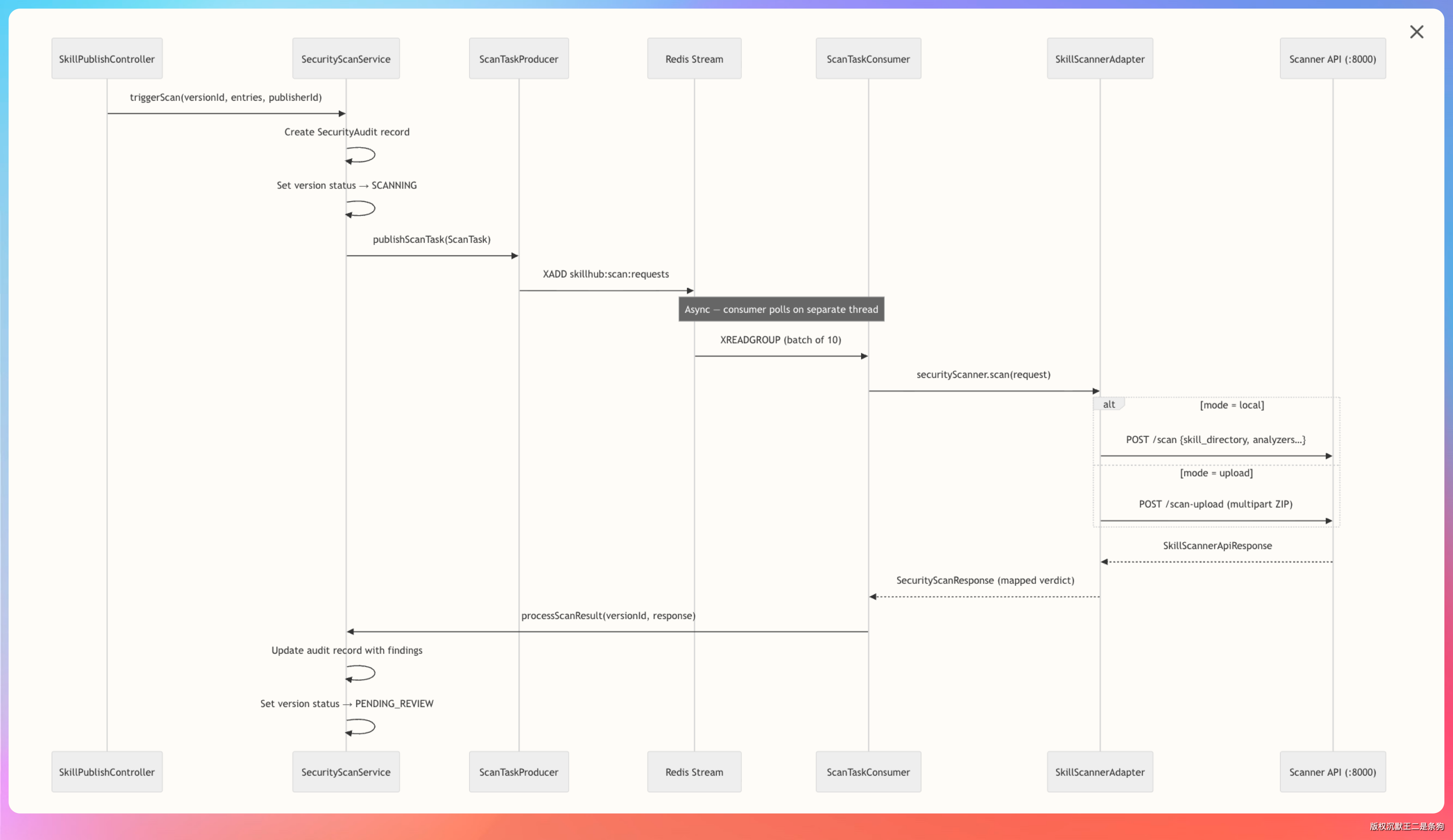 - 接入 Redis Stream + Scanner Adapter 的安全扫描链路,将 Skill 发布流程扩展为“上传校验 -> 安全扫描 -> 人工审核 -> 发布入库”,确保企业私有技能分发的安全合规